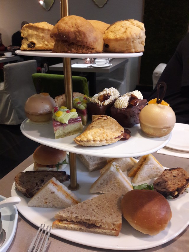 First of all, it came with a glass of non-alcoholic fizz, which was quite a pleasant addition. And last time we were served the food on slates, whereas now we finally had the coveted cake stand. Presentation-wise, this definitely had the wow factor!