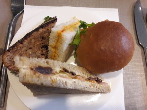 The other three sandwiches did go some way to making up for it, at least. We had chipotle cheese with caramelised onion chutney and rocket on rye bread, which was very good indeed, chiefly due to the deliciousness of the chutney. Then there was the BLT: the bacon was some really delicious aubgerine, which was a big hit. And the star of the show, unsurprisingly, was the brioche bun filled with cream cheese and smoked carrot ‘salmon’. I have never eaten anything quite so smoky – and now I can’t stop thinking about it! Perhaps my New Year’s Resolution will be to eat more smoked food…