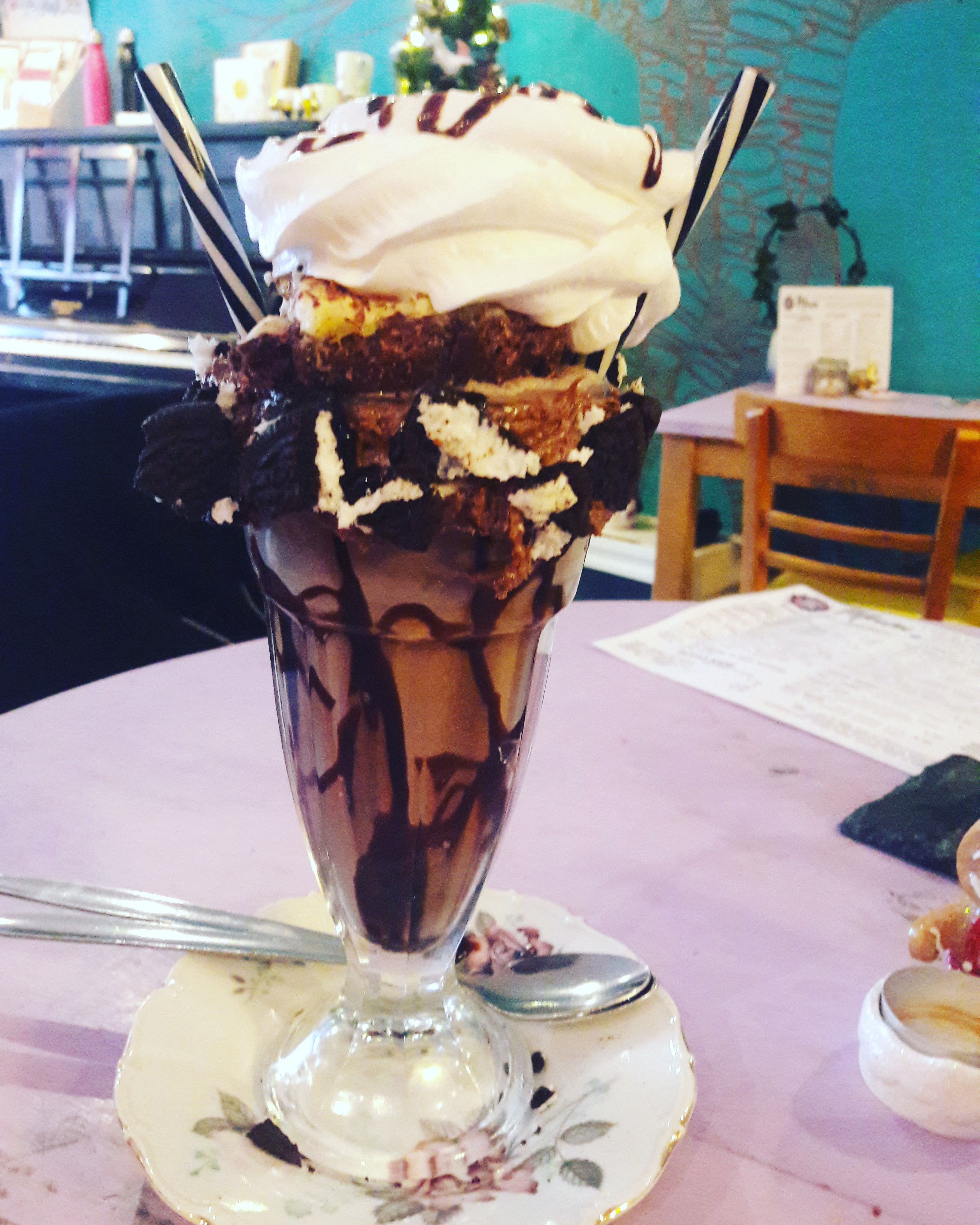 And we finished with this magnificent concoction. It has long been a goal of mine to try a freakshake (that’s a normal ambition to have, I assume), and there’s talk of them being banned in the UK for health reasons (which seems weird when cigarettes, alcohol, and meat are all still approved, and I’m guessing there are very few people who have a shake every day), so I had to try one while I still could. We shared the ‘Ain’t no Oreo back girl’, and I certainly couldn’t have tackled it solo. As you can see, there’s chocolate sauce around the glass, and the shake was presumably made from blitzed chocolate ice cream and milk. There were little Oreo chunks stuck around the top of the glass, and the shake was topped with a brownie and a mountain of cream.