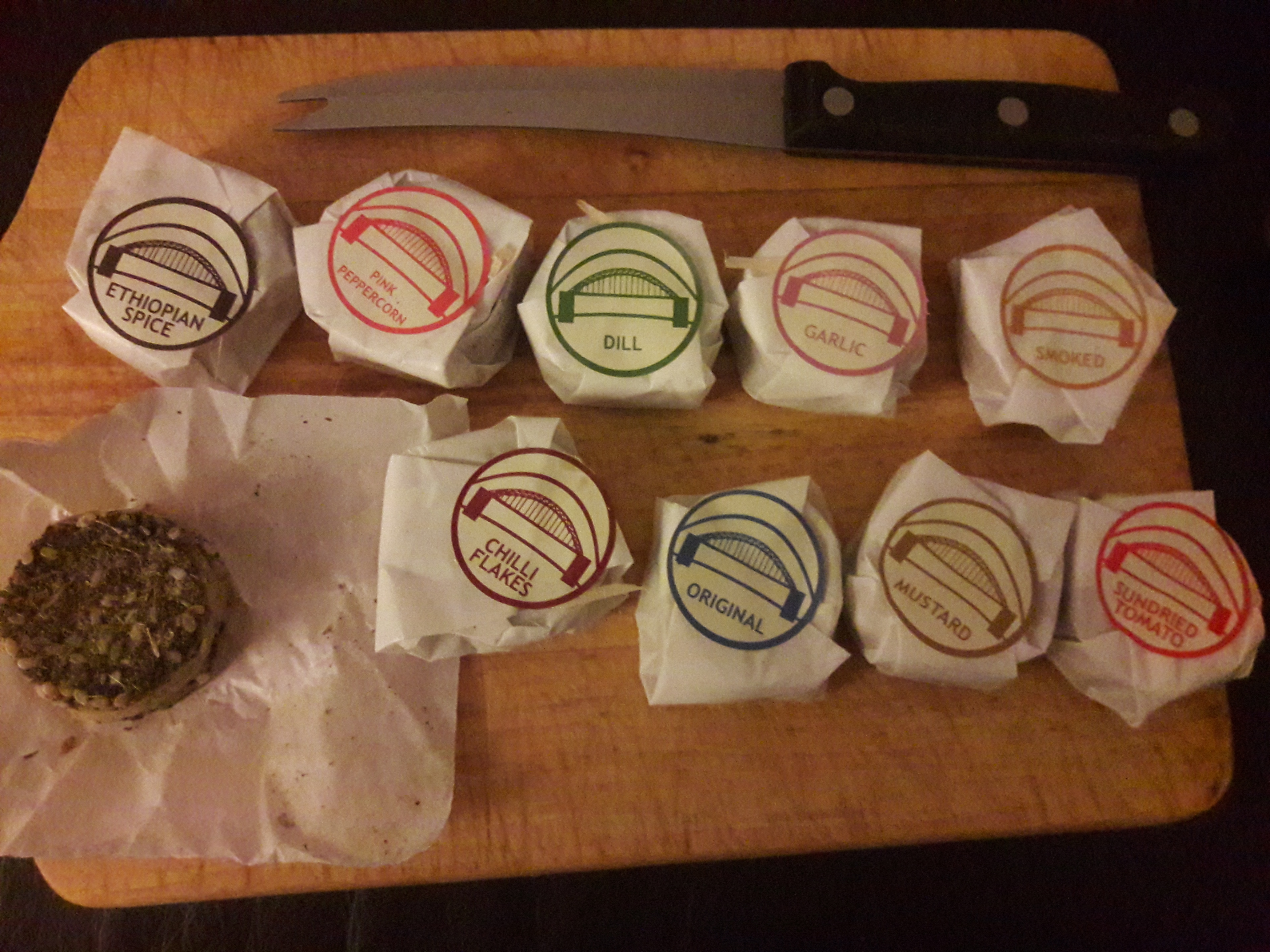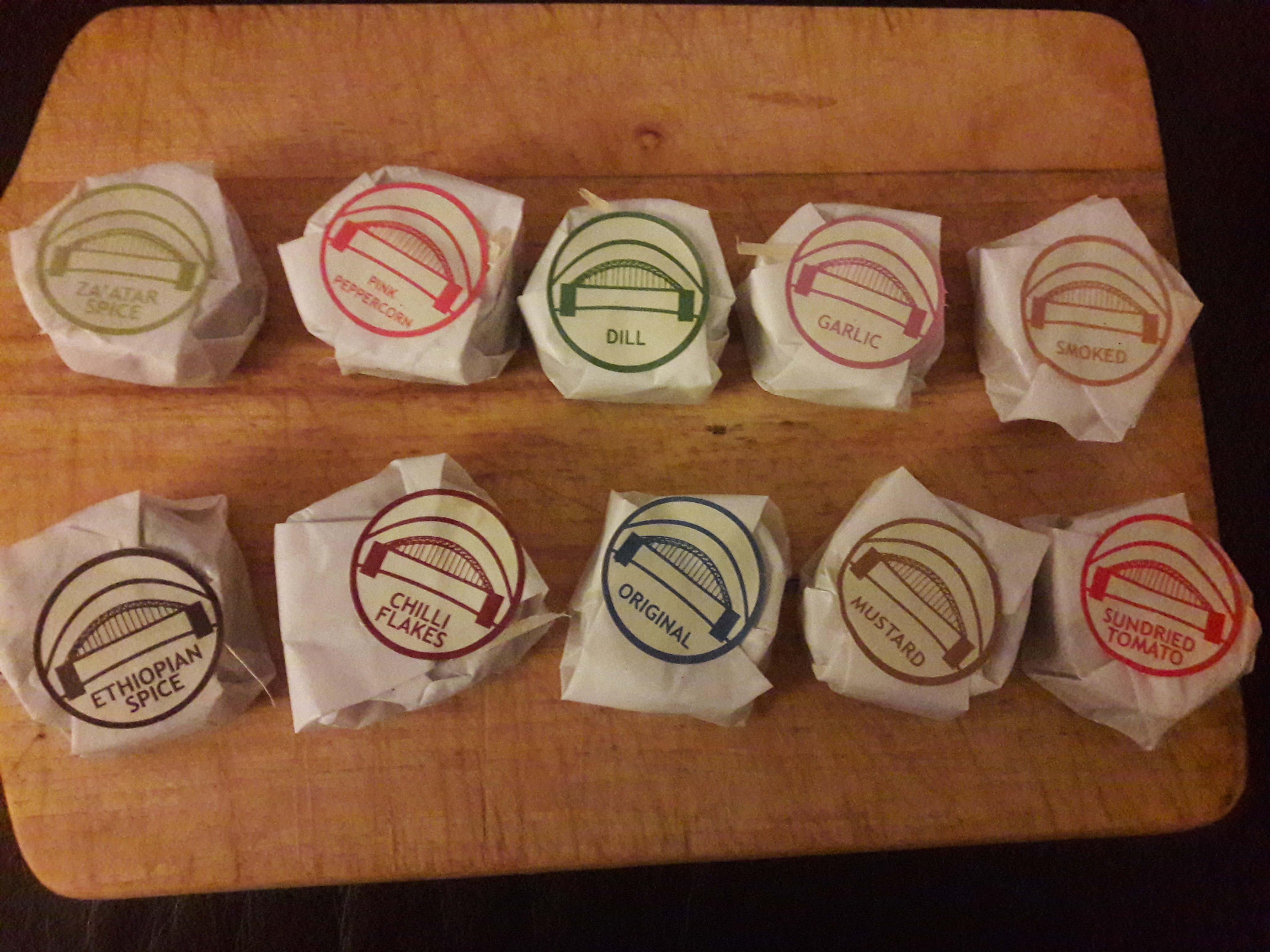 For each flavour, we simply chopped the cheese in half and slathered it thickly on a cracker. There were ten flavours: Za’atar spice, pink peppercorn, dill, garlic, smoked, Ethiopian spice, chilli flakes, original, mustard, and sundried tomato.