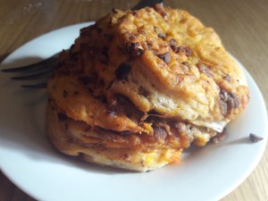 This is a pagáče. We have been reliably informed by the staff that this is a traditional Slovakian bake, and we’d describe it as somewhere between a savoury scones and a pastry – it has an incredible, kind of flaky texture. It’s speckled with bits of smoky tofu, which are of course delicious. I believe these are only available on Saturdays, so we always pick up a couple to takeaway for an afternoon snack.