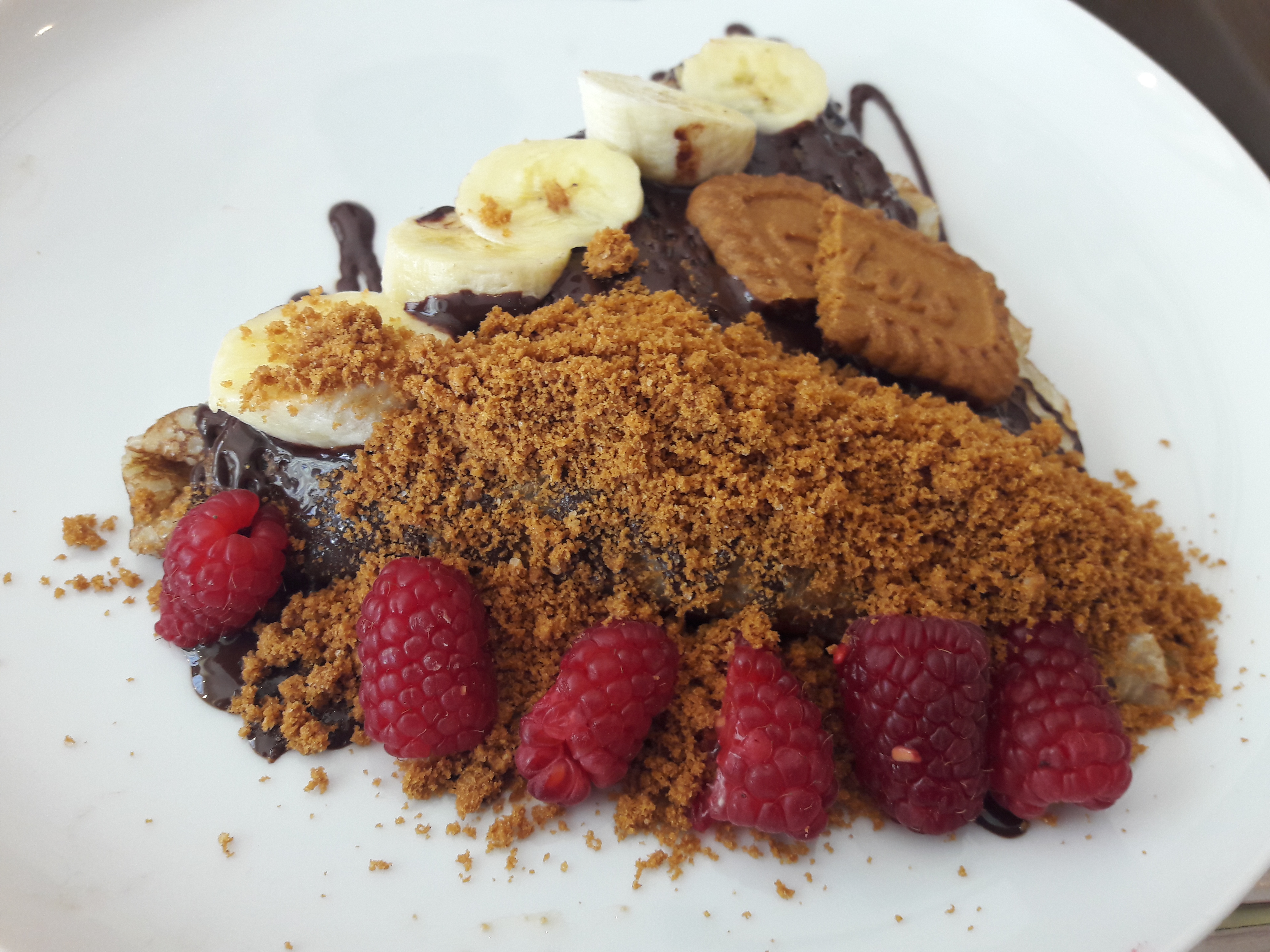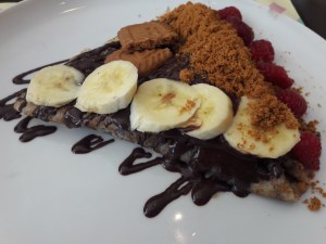 I was much more satisfied with my choice. A vegan crepe is quite rare in Prague – the chunky American-style pancakes are far more common. The crepe itself was lovely, if a little thicker than I was expecting, and I enjoyed the additions of raspberries, banana, chocolate sauce, and Lotus crumbs. Actually, the crumbs were the best part, adding a lovely crunchy texture. I would happily order this again every day!