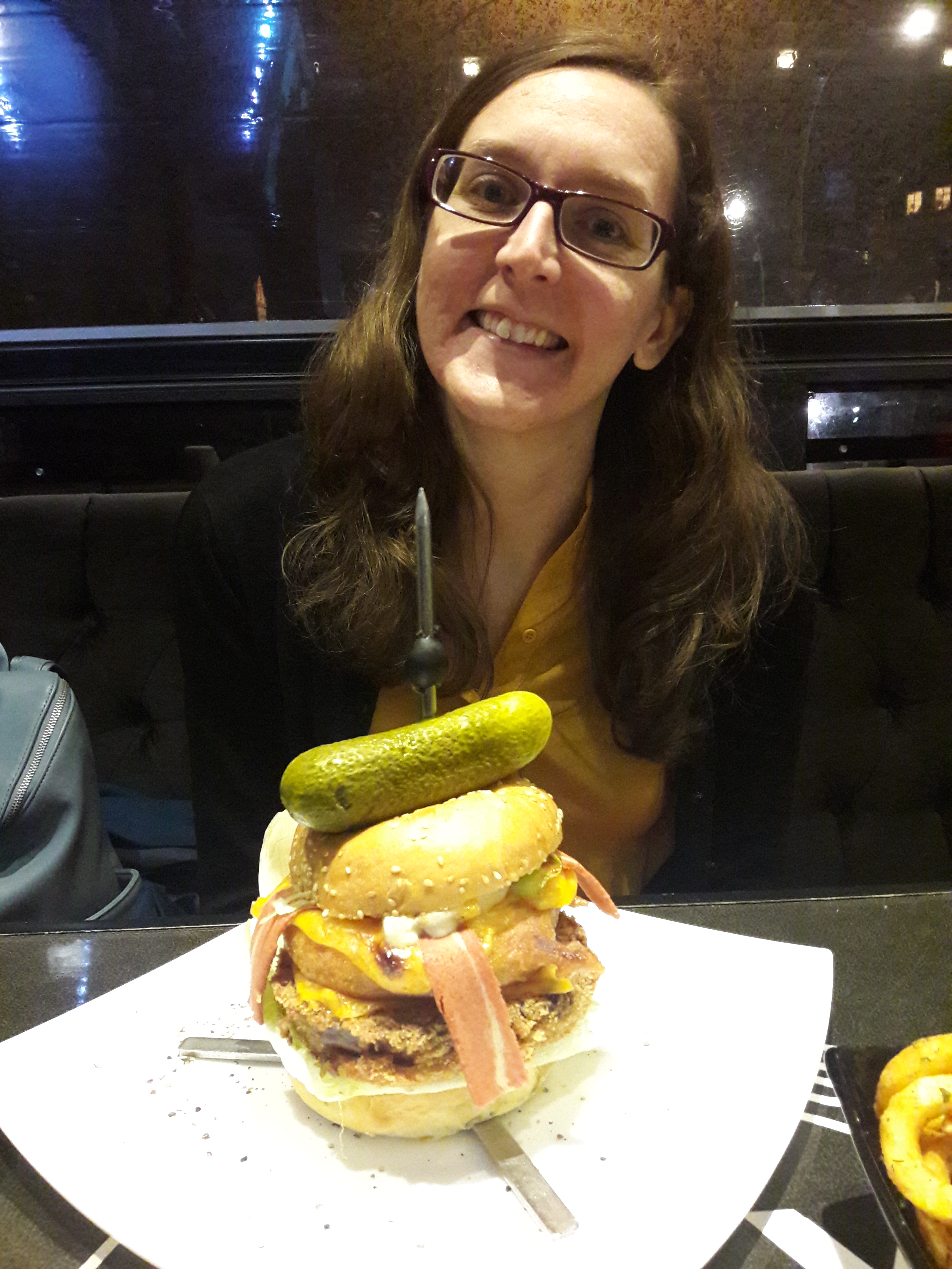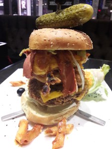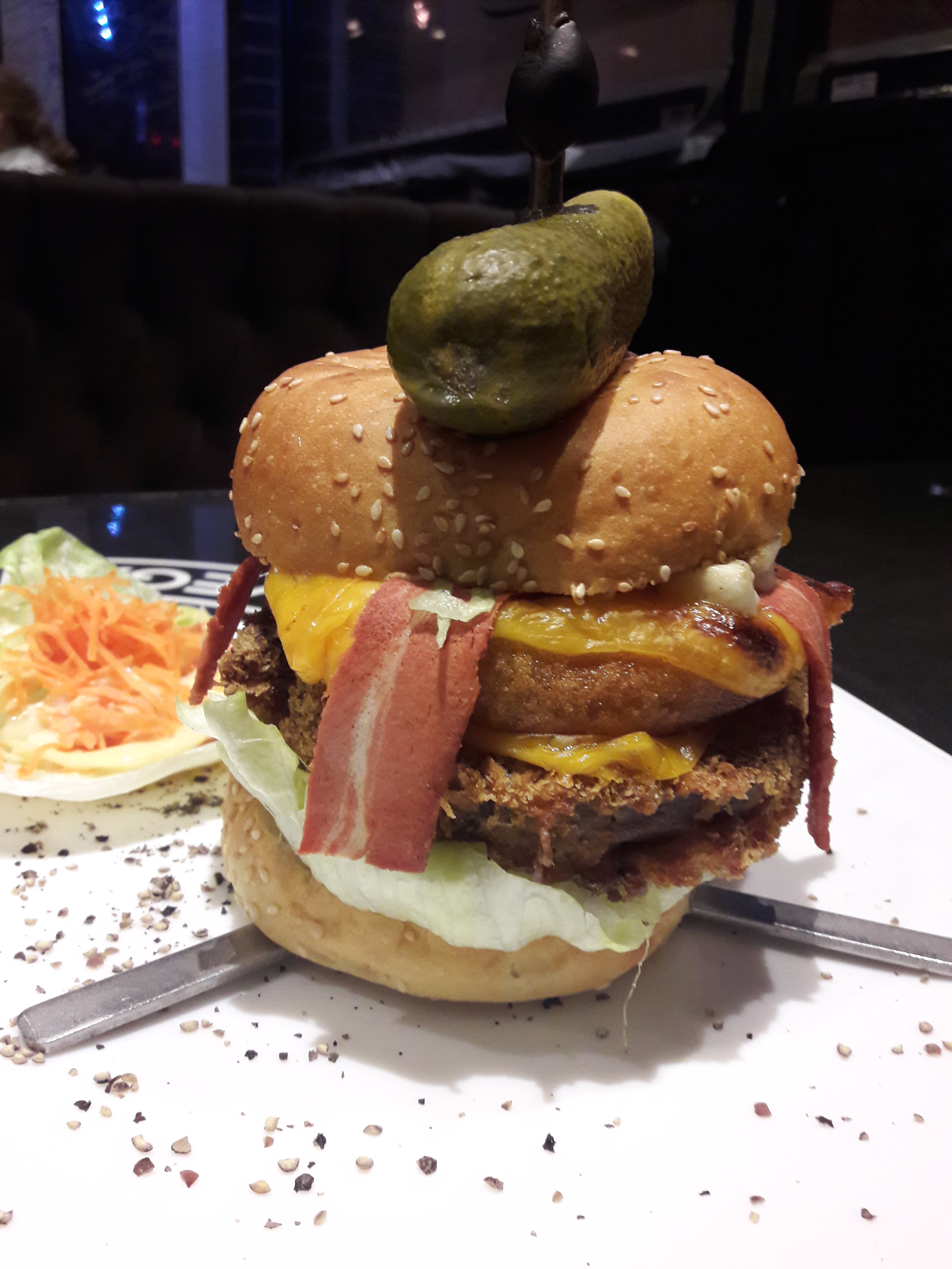 There’s only one vegan patty, a good crispy seitan one, so we started with that and then chose which concoction we’d like. Mine came with vegan cheddar, bacon, halloumi, BBQ sauce, and an onion ring. It was the tallest burger I’d ever tackled, and it was presented on a sturdy metal skewer. Obviously it had to be eaten with a knife and fork, which is never my favourite approach, but there was no alternative here.