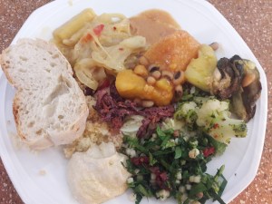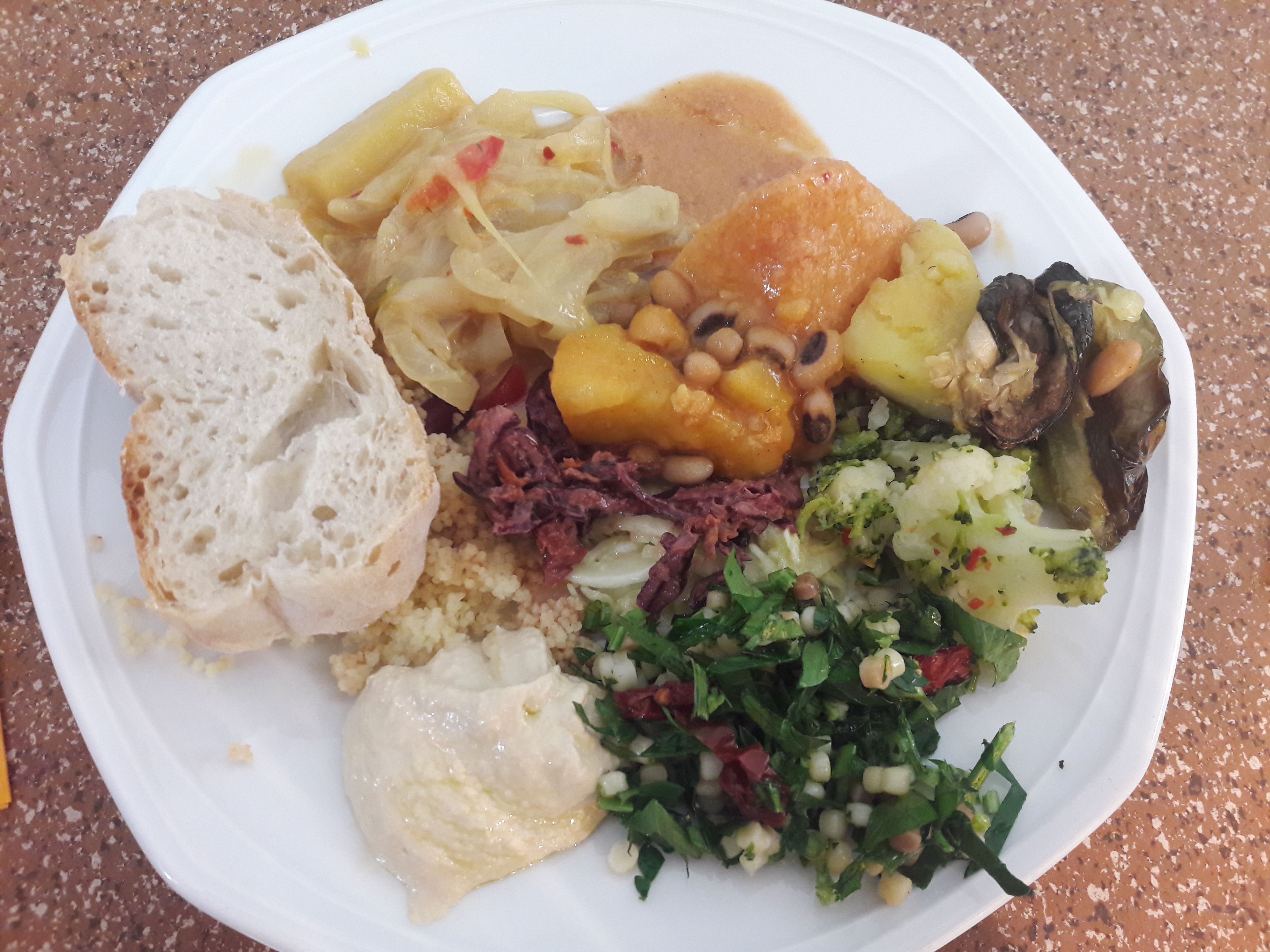 There were quite a lot of dishes to choose from, including two different kinds of hummus, an assortment of salads, some fluffy bread and crispy crackers, one aubergine antipasti dish, and a collection of African stews. There was a peanutty one that was very good indeed, and the hummus was also top notch. A pasta dish appeared at one point, but Dr HH reported that it was a pretty unexciting sauce. There was some falafel as well, briefly -that was good.