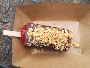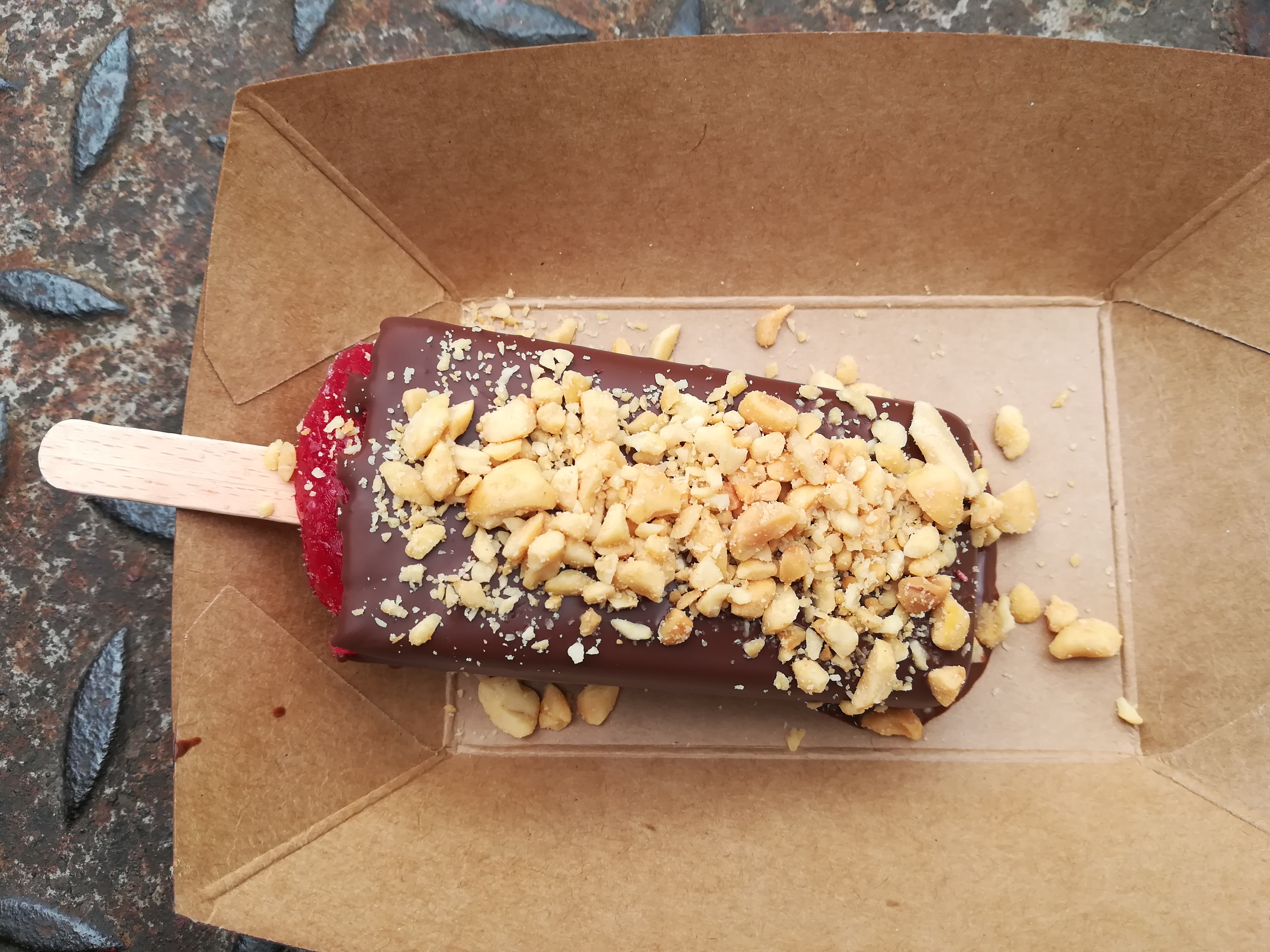 Finally, to pudding!  I had already decided to pass on Creme de la Creme, even though for the first time in Naplavka history the queue was not obscenely long.  I was tempted by Rolls Bros, but figured I knew I could taste their wares elsewhere. I eventually decided on a little stall with no visible sign (later research led to me believe that this was Juicee) that was selling ice cream on a stick, dipped in chocolate, and topped with nuts. This immediately brought back fond memories of StickHaus in Venice.  There were a few fruit flavours on offer: mango, strawberry and raspberry. I opted for the raspberry with chocolate and peanuts.  It wasn’t the delightful creamy treat I was hoping for, and was more of an ice lolly than an ice cream, but it was tasty nonetheless.  The combination of raspberry and dark chocolate was well balanced and the peanuts gave it a nice crunch.