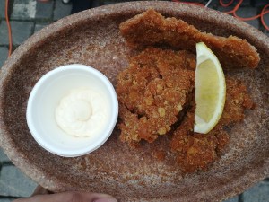 First up on my list were the chickpea and seitan wings with dip from Ovegano.  From what I could glean from their website, Ovegano are based in Brno, where they do some pop up events and also sell some of their products at a few different restaurants and cafes in the city.   I was initially drawn to this stand on my first wander through, but as I got closer most of the branding I could see on the tent was for a raw cafe. Raw wings sounded a lot less appealing!  On my second pass I spotted a fryer in the back, so I dived right in.
