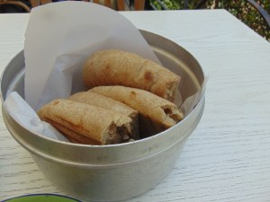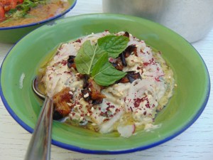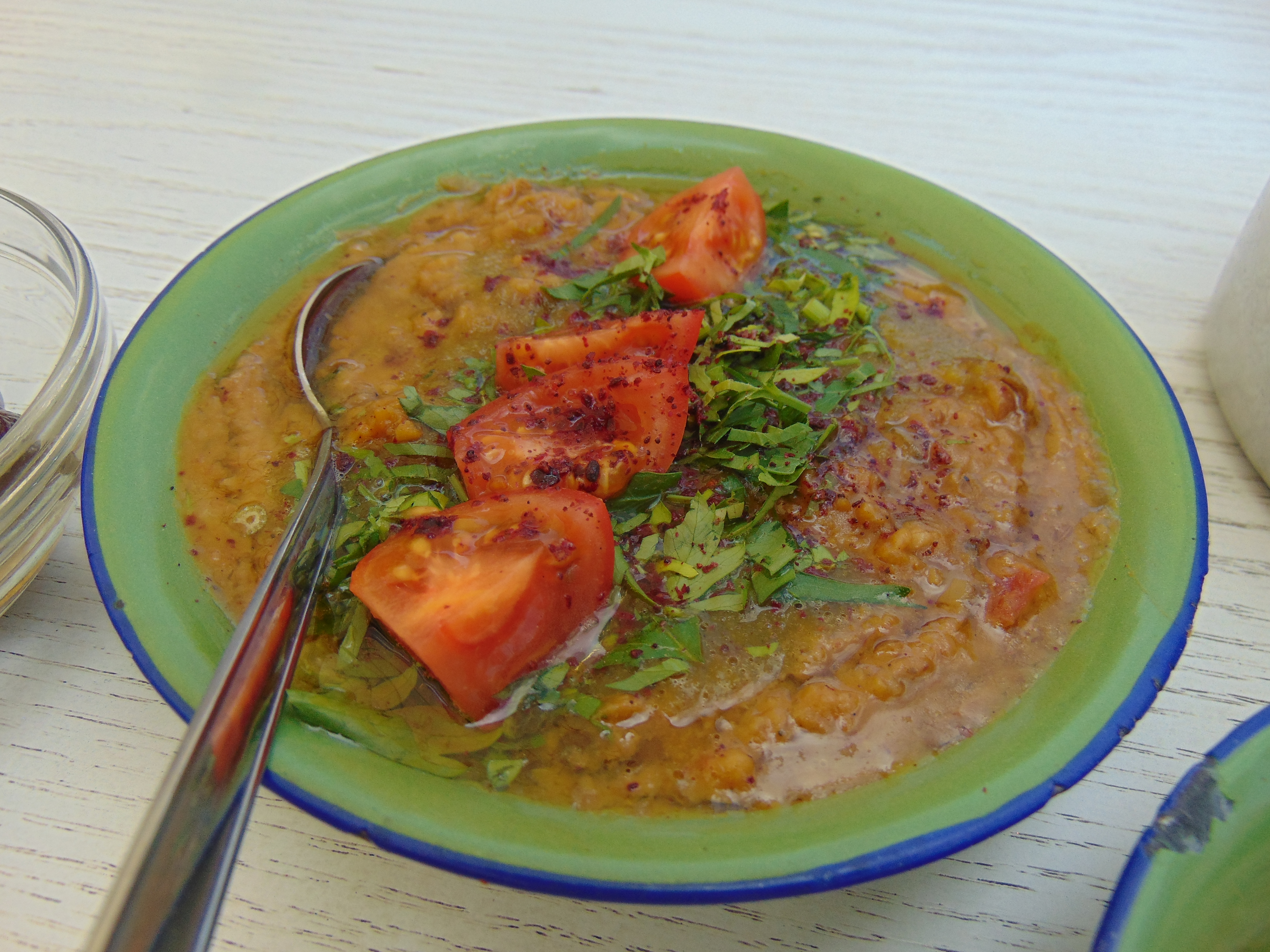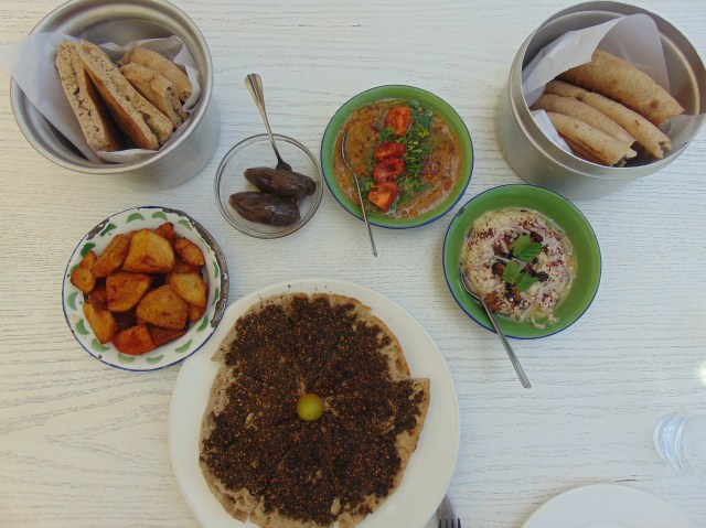 The menu marked the vegan options, which is always appreciated. We decided to properly treat ourselves, as it was our only real culinary indulgence of the trip. The main reason we chose this place was because of the za’atar and olive oil bread on the menu. Just look at all that za’atar! This was everything I’d hoped for, it was really delicious – though the za-atar was quite loose and made a bit of a mess. Interestingly, the people at the table next to us were brushing all the za-atar off and just eating the bread base…clearly it was not what they’d been expecting.