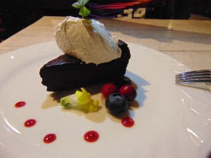 And he got the creme brulee for dessert, while I tried the chocolate gateau, which was insanely rich and chocolatey – very good indeed, but possibly a bit much after a big dinner.