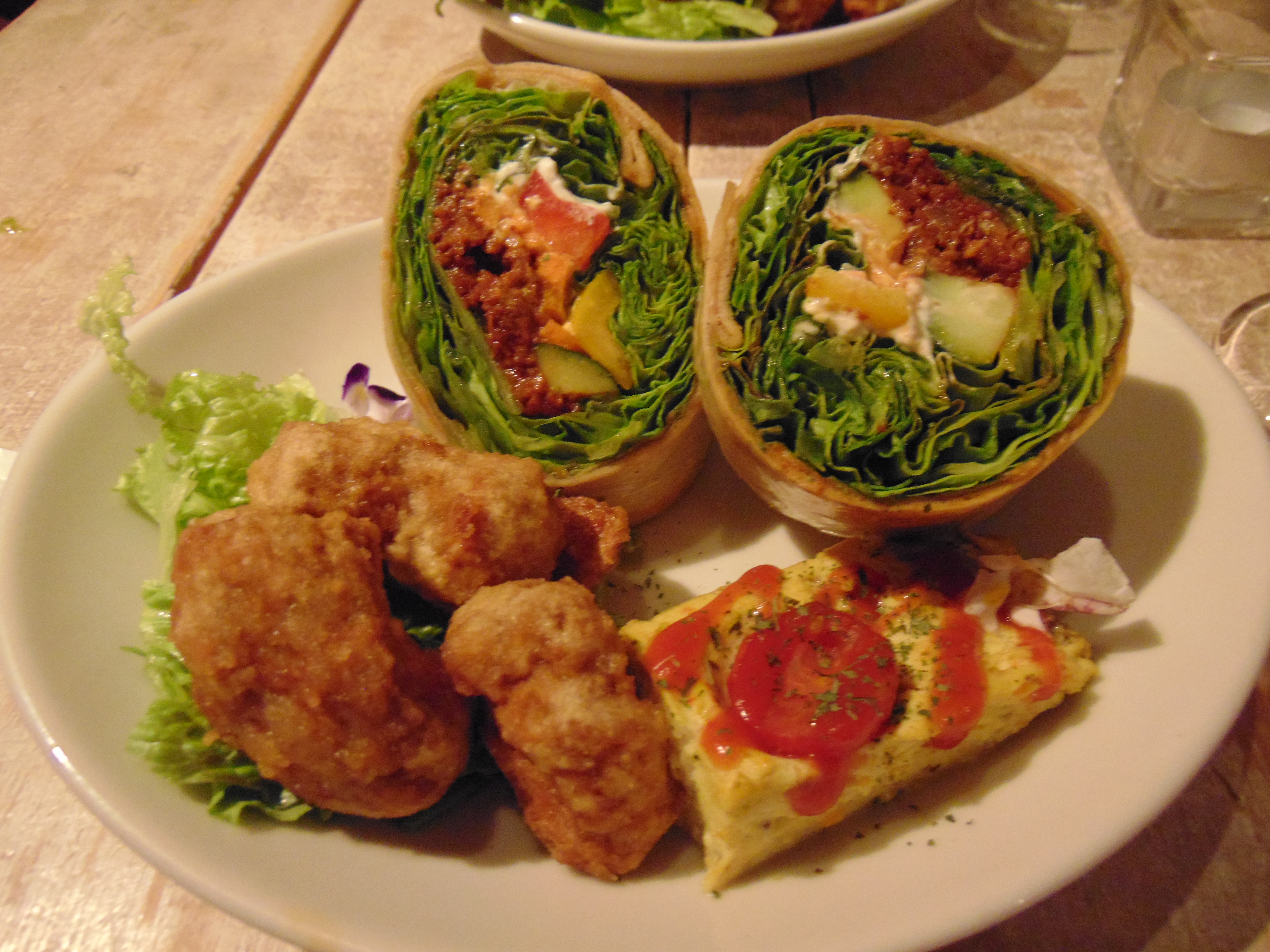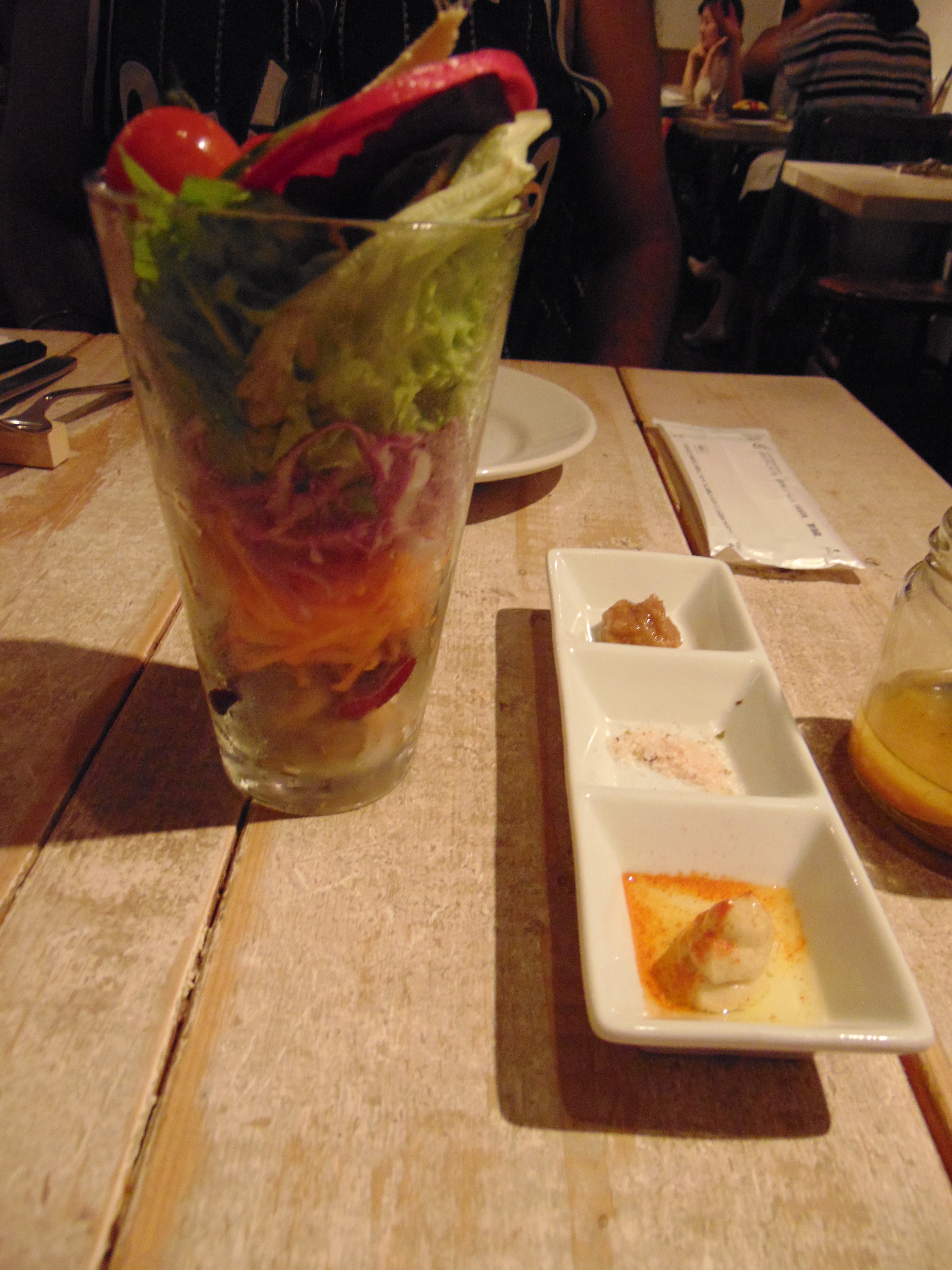 Dr HH, on the other hand, ordered the Everything Course, a set menu including a little bit of everything from the menu (well, not quite everything, but a lot!). Unfortunately, most of the dishes were a bit underwhelming. The salad parfait sounded exciting but it was just a salad in a glass – though the dressing was reportedly very tasty. The tomato soup was a bit uninspired. On the main plate, the karaage was the highlight (good to know I’d picked a winner!), the Spanish omelette was good but not groundbreaking, and the wrap was very leafy but still flavoursome.