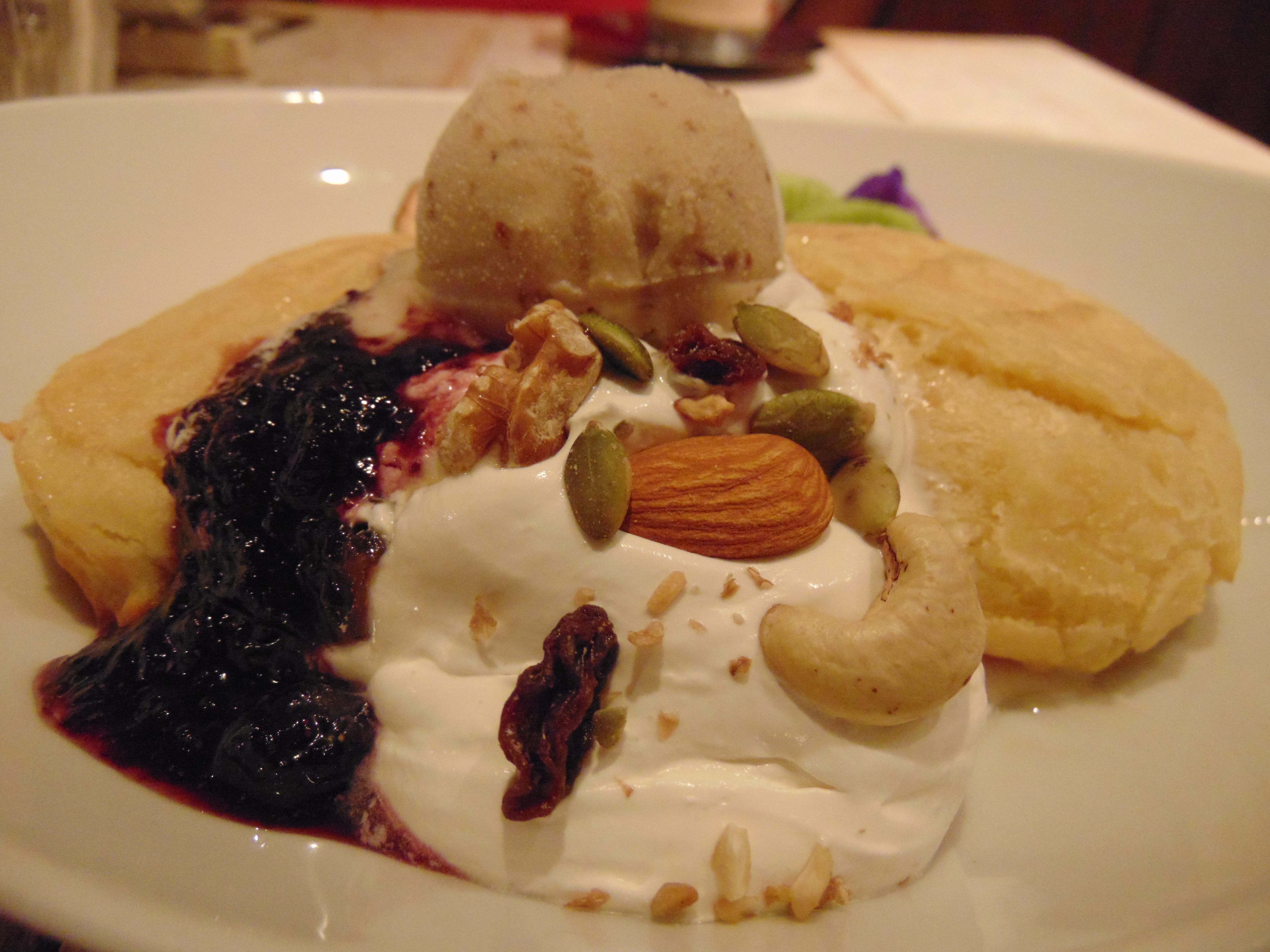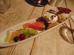 His dessert plate was also a bit underwhelming: there was some fruit (yawn), a strawberry cake with cream on top, and some rum and raisin ice cream. They were all good but not overwhelmingly so. My dessert, on the other hand…