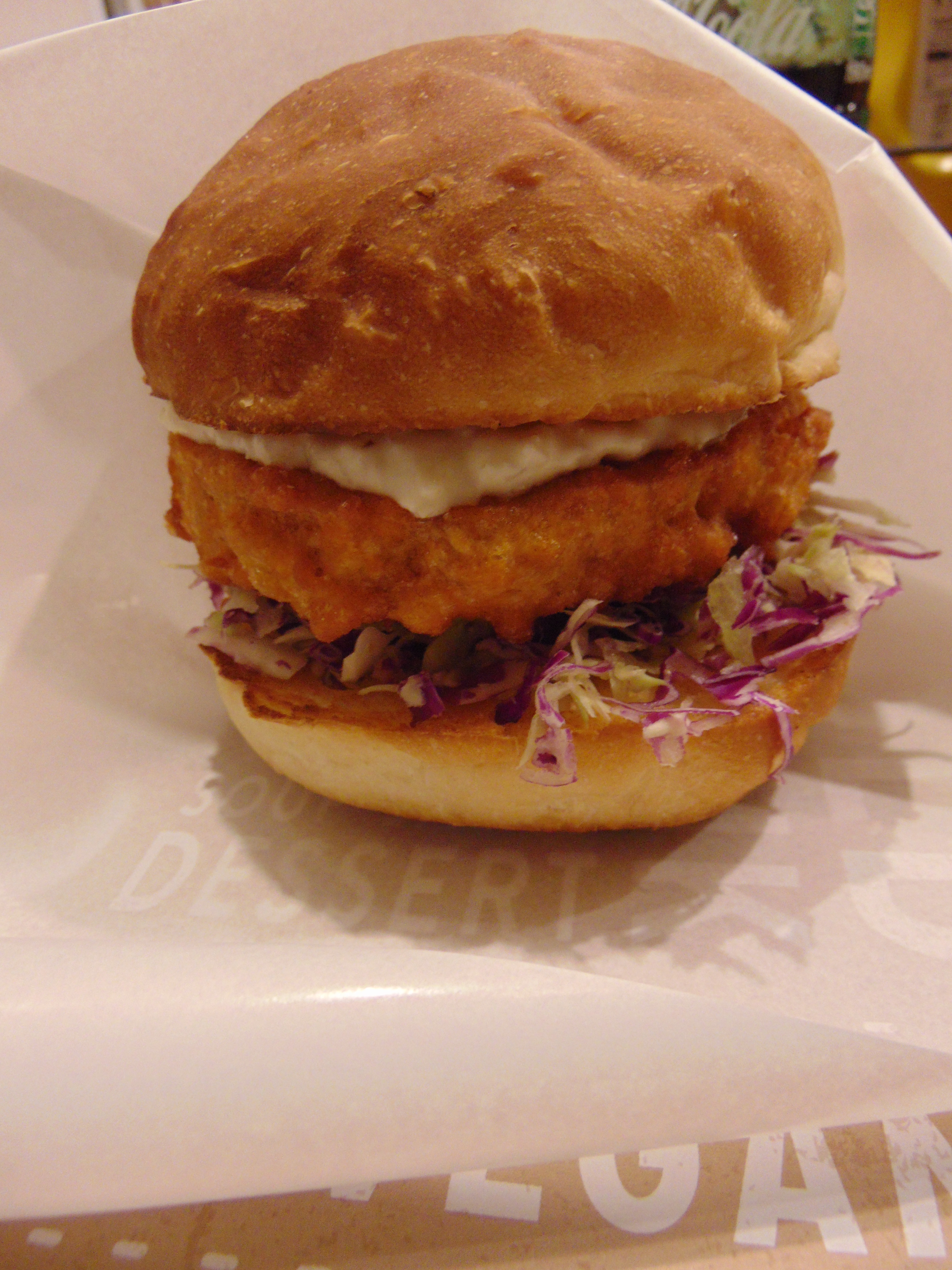 This place was a small, predominantly takeaway place with one big communal table, a nice relaxed atmosphere, and an excellent Aimee Mann soundtrack. The menu consisted of four different burgers, one salad, a burrito and burrito bowl, and a few side dishes. I can rarely resist mock chicken, so I opted for the crispy chicken burger. It did not disappoint! The patty had great texture and taste, and was really juicy and delicious, except for getting a bit lost under all that tartare sauce.