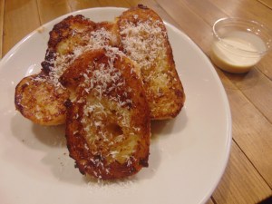 After so much travelling, of course we needed a dessert too! They offered waffles and French toast, and we decided to share the latter – we weren’t really hungry at this point, we just wanted the first sweet treat of the holiday. Due to something of a miscommunication with the server, we ended up with a little pot of sour cream on the side. Dr HH was bold enough to assume that the Japanese had discovered a delicacy that the rest of us have overlooked by pairing French toast with sour cream…alas, they have not. It was not a good combo. Fortunately, the toast on its own was excellent: super soft inside, with lovely flavours of coconut and maple.
