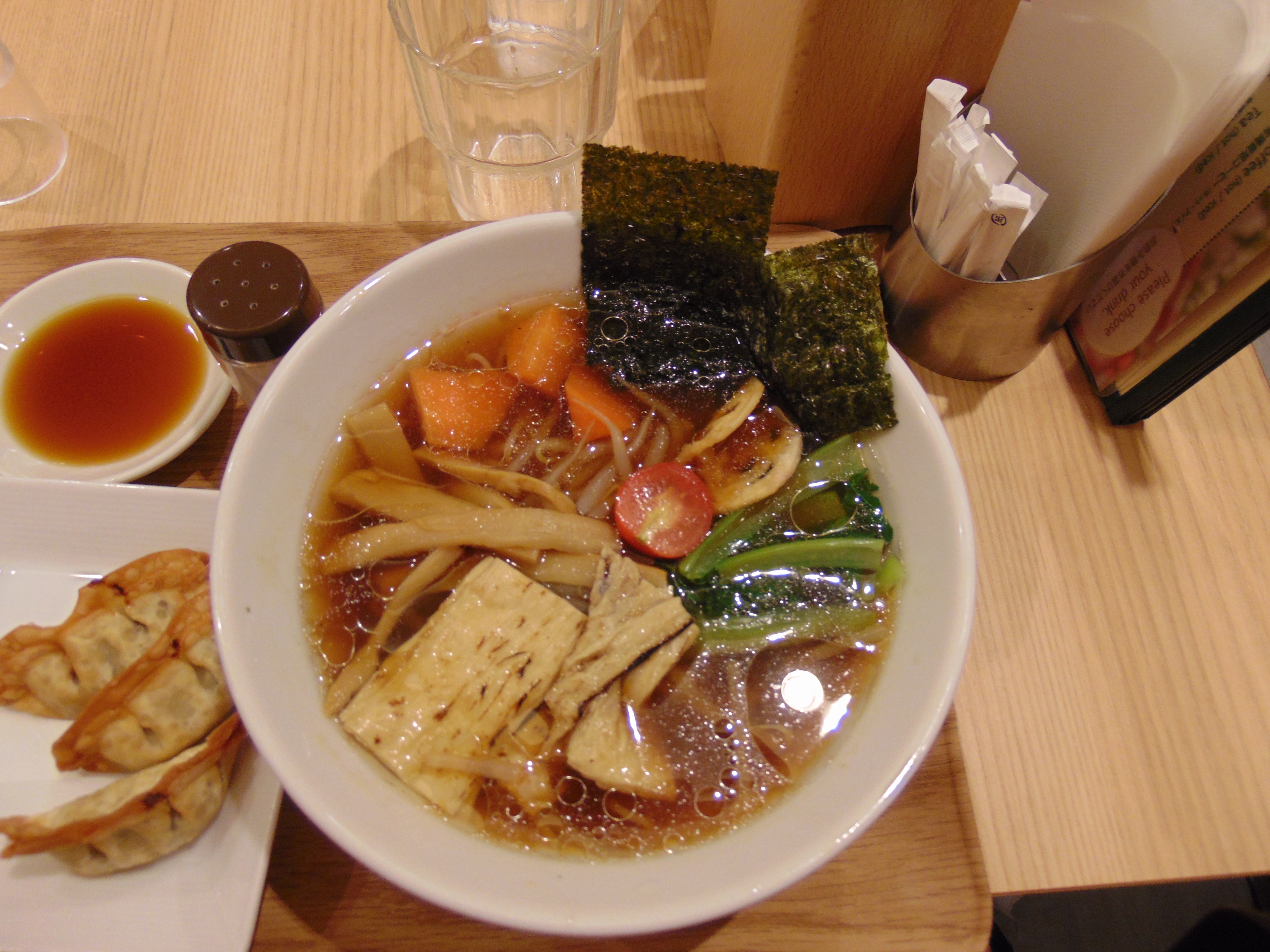 Several days into my Japanese VeganMoFo theme, it’s finally time for some bonafide Japanese food! I wasn’t really sure how much Japanese food we’d find in vegan eateries, and I’d expected to find a reasonable amount of vegan sushi. But in fact we only had sushi once in the whole trip, and the real dish that delighted us was ramen. I hadn’t eaten much ramen before, but I was very excited about the prospect of trying it at the various T’s establishments around Tokyo, as I’d heard from other vegan travellers that this is Tokyo’s must-visit vegan establishment.
