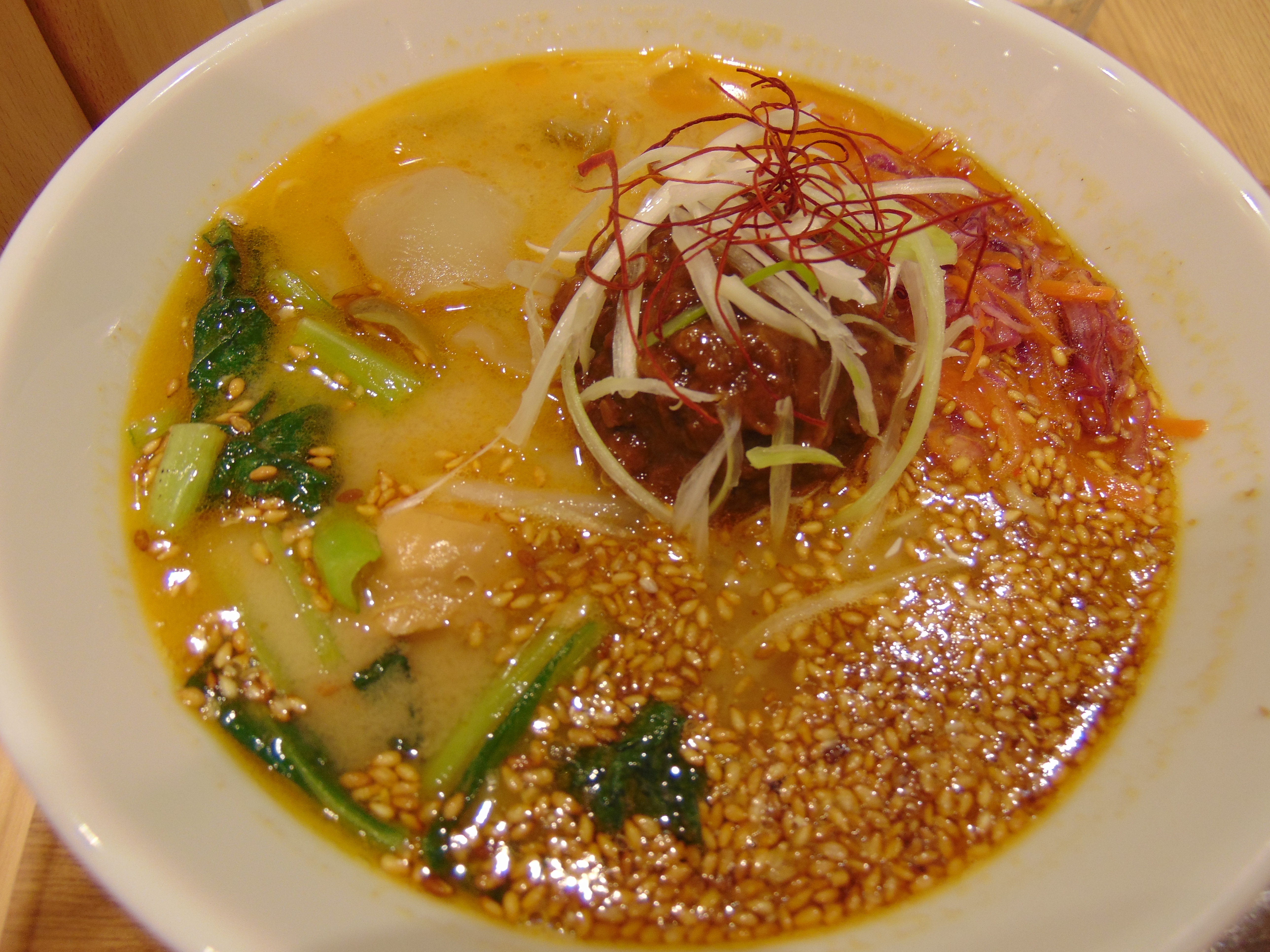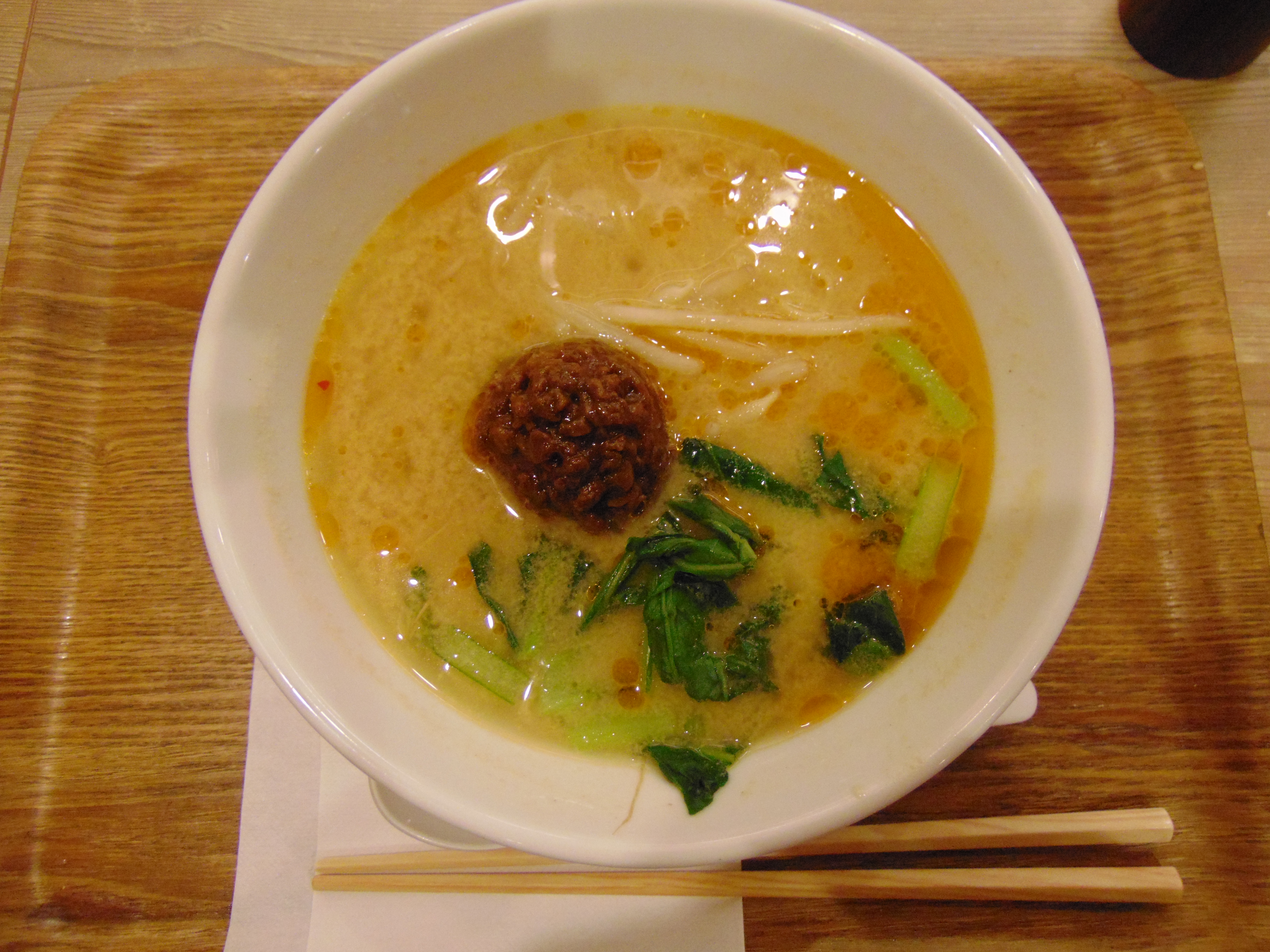 And then we were back for more in the evening when we got off the train! The gold sesame tantan had a similar nutty broth to the breakfast one, and the same beefy ball. However, it was more exciting than the breakfast version, because it had more stuff in general, including a dollop of peanut butter and a heap of sesame seeds. These are all good things in my book!