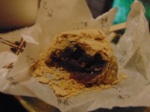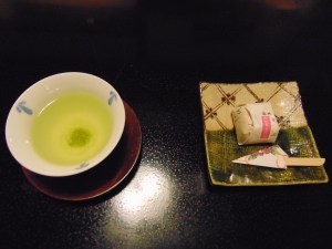 On arrival, she took us into our room and made us a pot of tea and served us this welcome mochi – the equivalent of leaving a little chocolate on the bed, I suppose! (Incidentally, there were no beds at this stage – the floor was all mats and the low table so we could sit cross-legged and eat, and after dinner the staff came and set up some futons for us. The room was so lovely, with sliding paper doors, and the sound of the river right outside.)