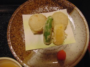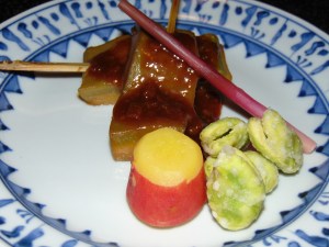 This plate was also excellent, though I can’t say with any certainty what things were! On the skewers were some bright green gelatinous slabs absolutely coated in miso sauce – they were incredible! We think the tasty yellow and red vegetable was a yam, and there were some delicious green beans.