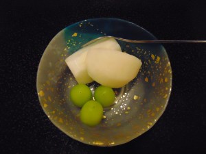 This course was a bit of a miss: a huge portion of cold noodles with a fairly bland sauce (there was a dollop of wasabi which we were advised to use to season the sauce, but I hate wasabi and Dr HH said it wasn’t that much of an improvement anyway). So there wasn’t much flavour going on, and it was such a big portion that it really filled us up when we would have prepared to save room for the more exciting elements.
