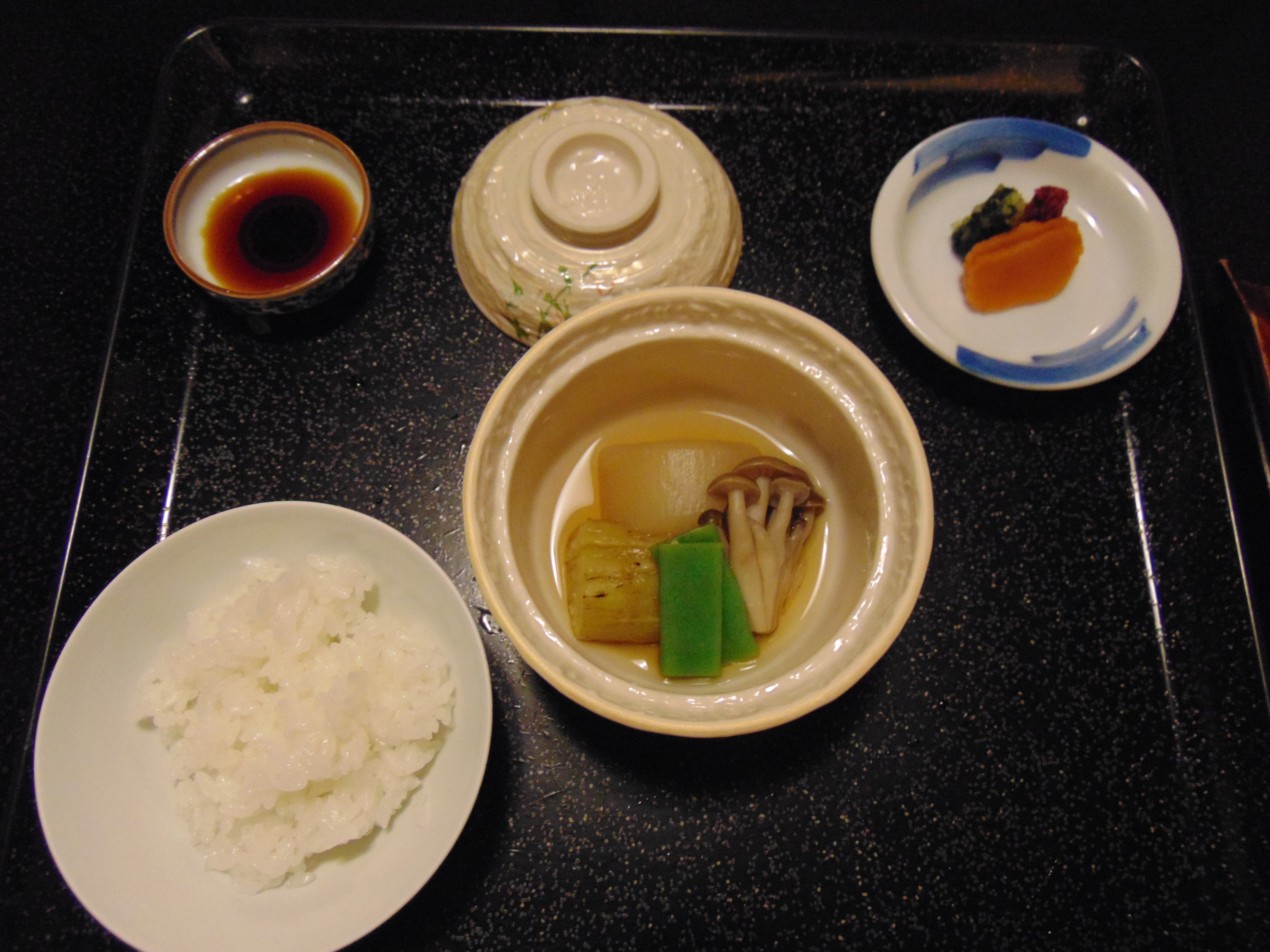 In the top left corner was something we described as “mushroom mush”, and I can be no more specific than that, except to say that it was really earthy but a bit samey. The dish to the right of that was delicious: some greens and tofu skin in a little bit of flavoursome broth. We both loved this, and the tofu in the top right corner which was really nicely prepared. In the bottom right is a soup with tofu cubes in it, which was an improvement on the dull miso soup of the night before. The big tray also included some rice, nori sheets, and soy sauce, which reliably filled us up.