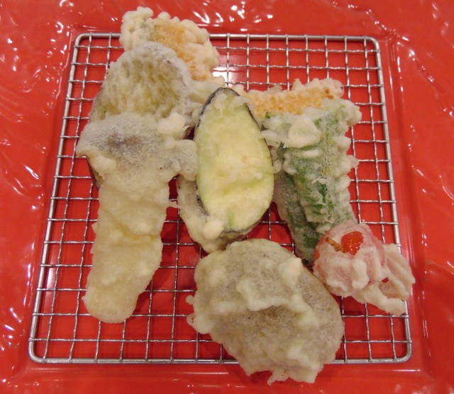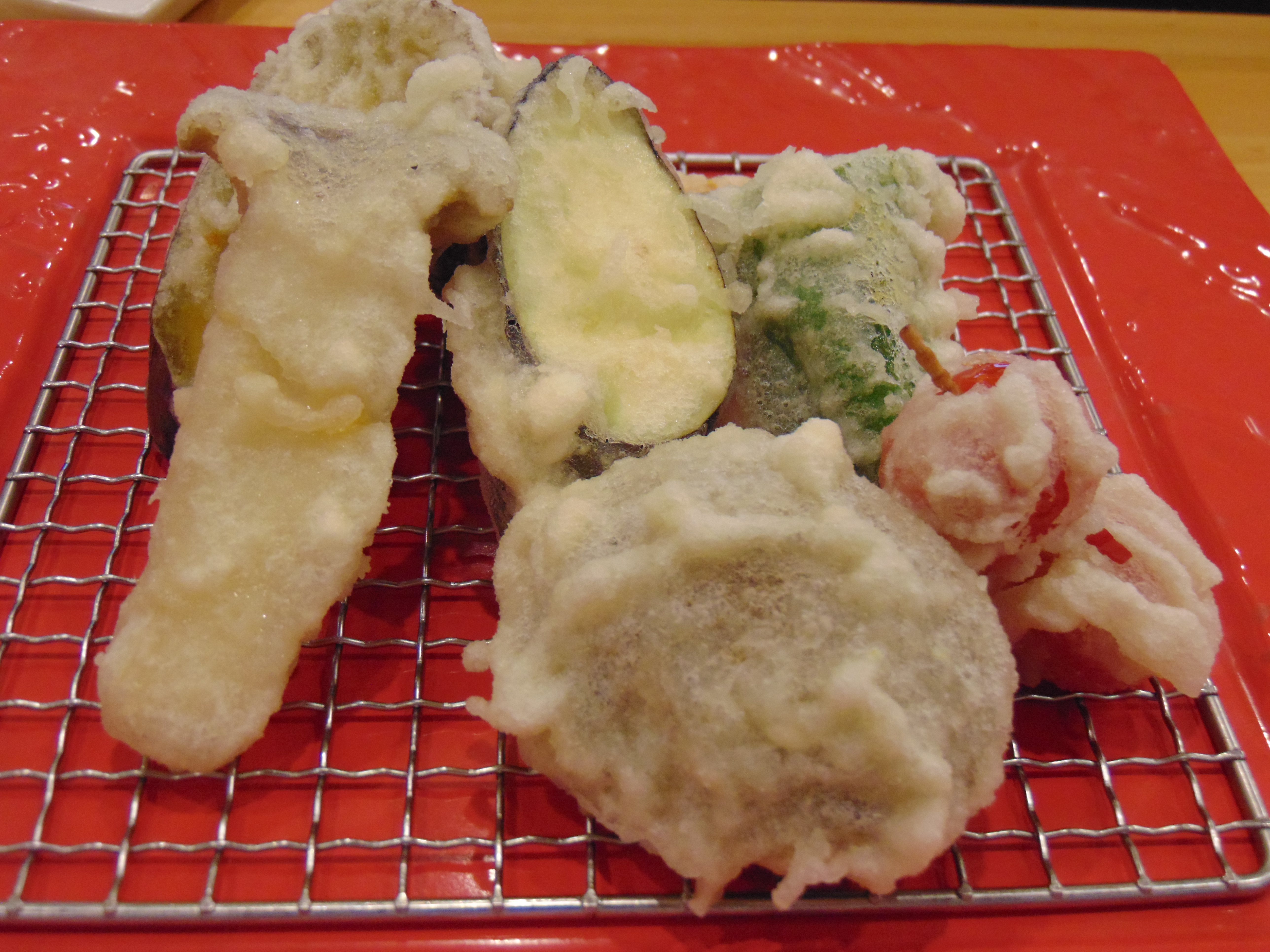 The first page of the menu confidently states that vegan options are marked in the menu and egg-less batter can be requested either verbally or by pointing at this page in the menu – I was a big fan of that! It turned out that there was only one option that was marked as vegan, but it was a vegetable (yasai) assorted tempura set, so we had no complaints. You could pay a little extra to upgrade for unlimited rice and miso soup, so we went for that.