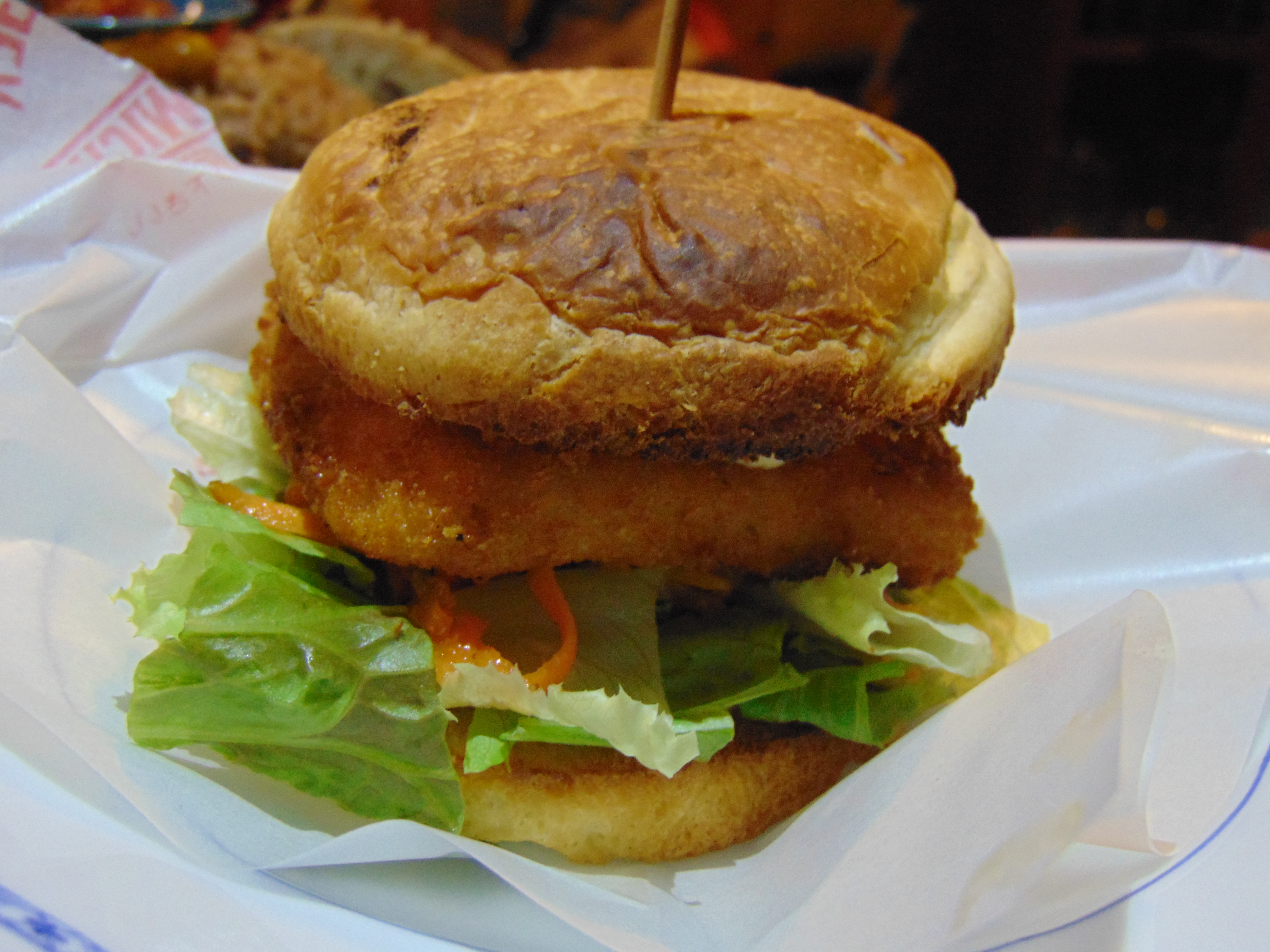 I got the fish burger, which came with no accompaniments! The burger had a really good fishy taste, and the patty was pristine white inside – I’m really intrigued as to what it was made of. The toasted bun was great too. It was a good and fairly unusual burger, and I’m not sure I’ve had a fish burger before.