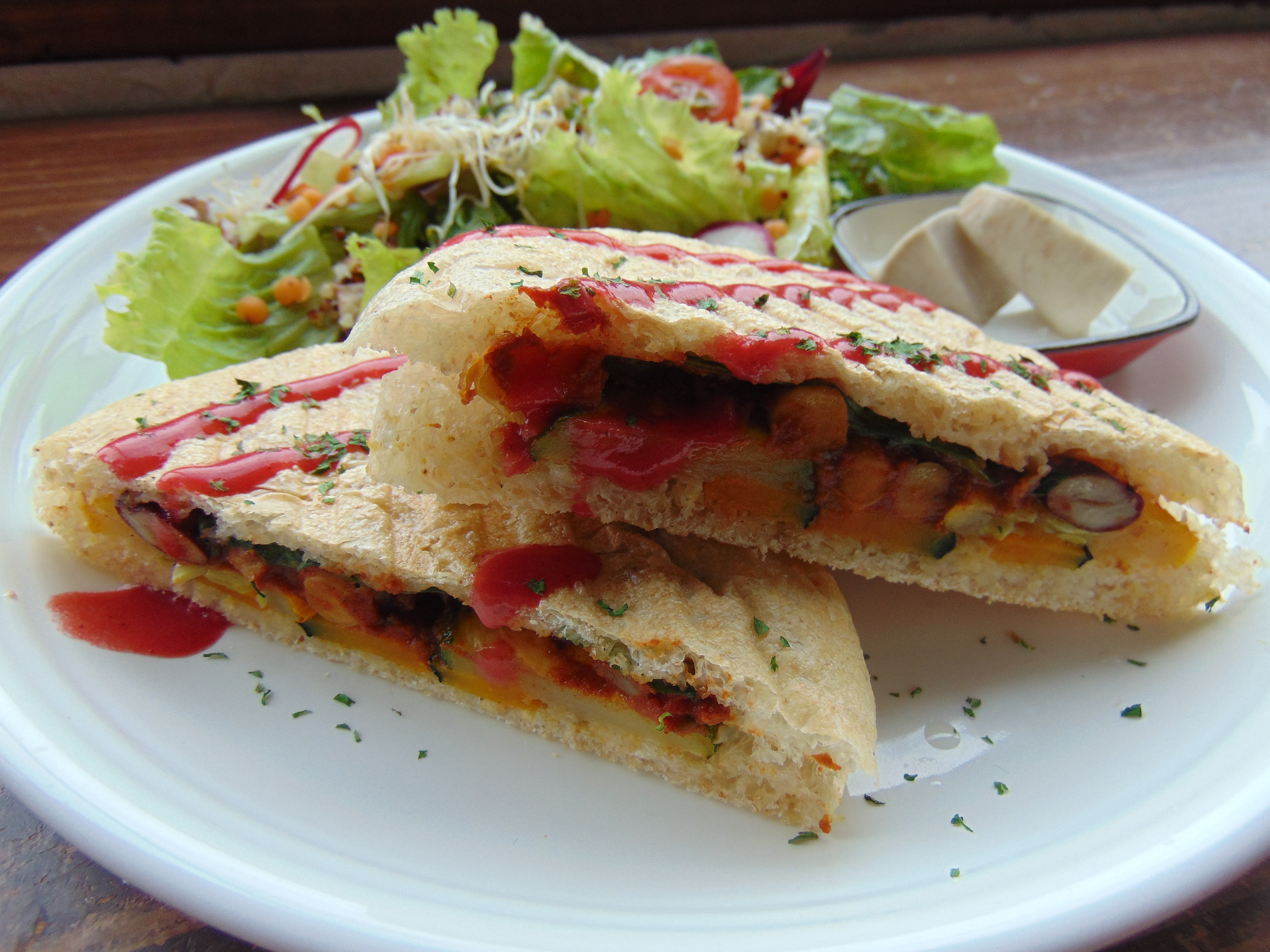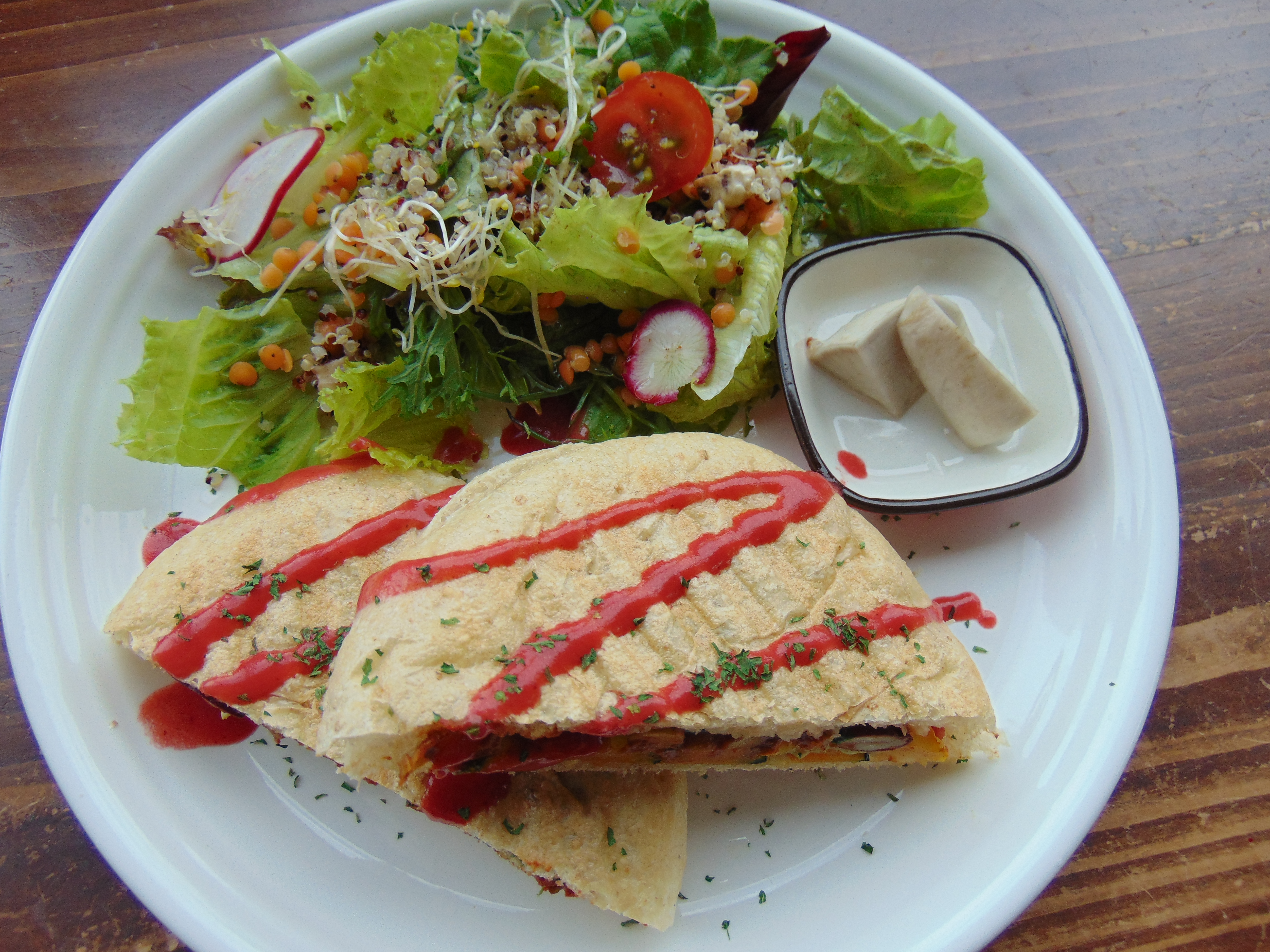 We also encountered some silly tourists back in Kyoto at Veg Out, a lovely light, spacious spot overlooking the river. There was a pretty small menu, but the options were fairly tempting. I ordered the panini, which was filled with roasted veg and allegedly tofu feta, though there was clearly none in mine – not a big deal, but they should have told me when I ordered. It was tasty and filling, a solid lunch.