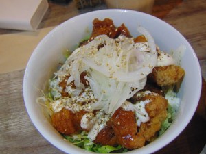 Dr HH took a leaf out of my book and ordered the karaage donburi. Karaage is the juicy, tender deep fried chicken that I was already hooked on. Donburi apparently means that it comes with rice and salad (not pictured, you know what rice looks like). He was very pleased with it.
