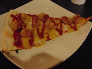 And we each got a slice of BBQ chicken pizza, which was delicious! There was lots of cheese (though it seemed more of a creamy cheese sauce than regular melted cheese), plenty of BBQ sauce for flavour, and a generous helping of tasty little chicken bites. This was absolutely wonderful! From the menu we got the impression that the vegan pizzas weren’t available as a whole, you could only order by the slice, which was a shame – a whole one of these would have been sensational!