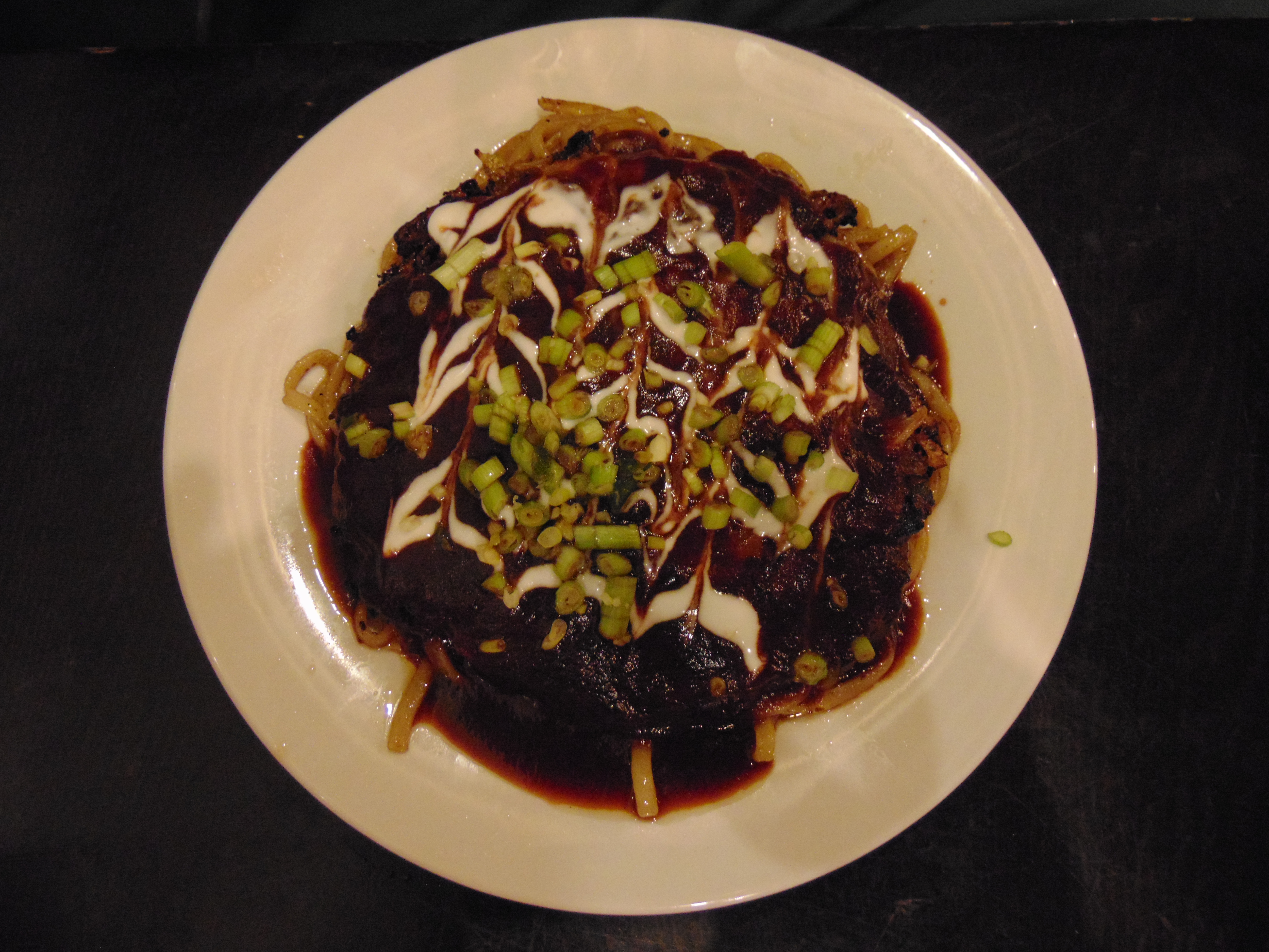 Dr HH went Japanese and ordered the okonomiyaki, a local speciality which we were yet to see veganised before coming here. Essentially it was a bed of noodles topping with a thin pancake featuring spring onions, cabbage and carrot, and the whole thing was absolutely swimming in teriyaki sauce. There was far too much sauce, so he wasn’t overly impressed by this, but was pleased to get to try the dish anyway.