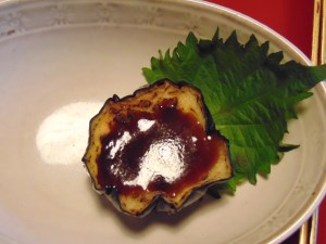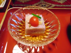 This tray was where the lines between sweet and savoury began to blur somewhat! The aubergine was well cooked and served with a sticky, tasty sauce. Everything on the white plate at the back tasted quite neutral: there was some extremely bland seaweed, a pickled pink flower, and four flavourless gelatinous shapes. We weren’t really sure what was going on. The dish in the front left was more baffling still – we could best describe it as some kind of sweet, fig-type fruit in pink syrup with some gelatinous shapes. It felt quite otherworldly. Also there was a fruit plate, which was unexciting but at least I knew what to expect from it!