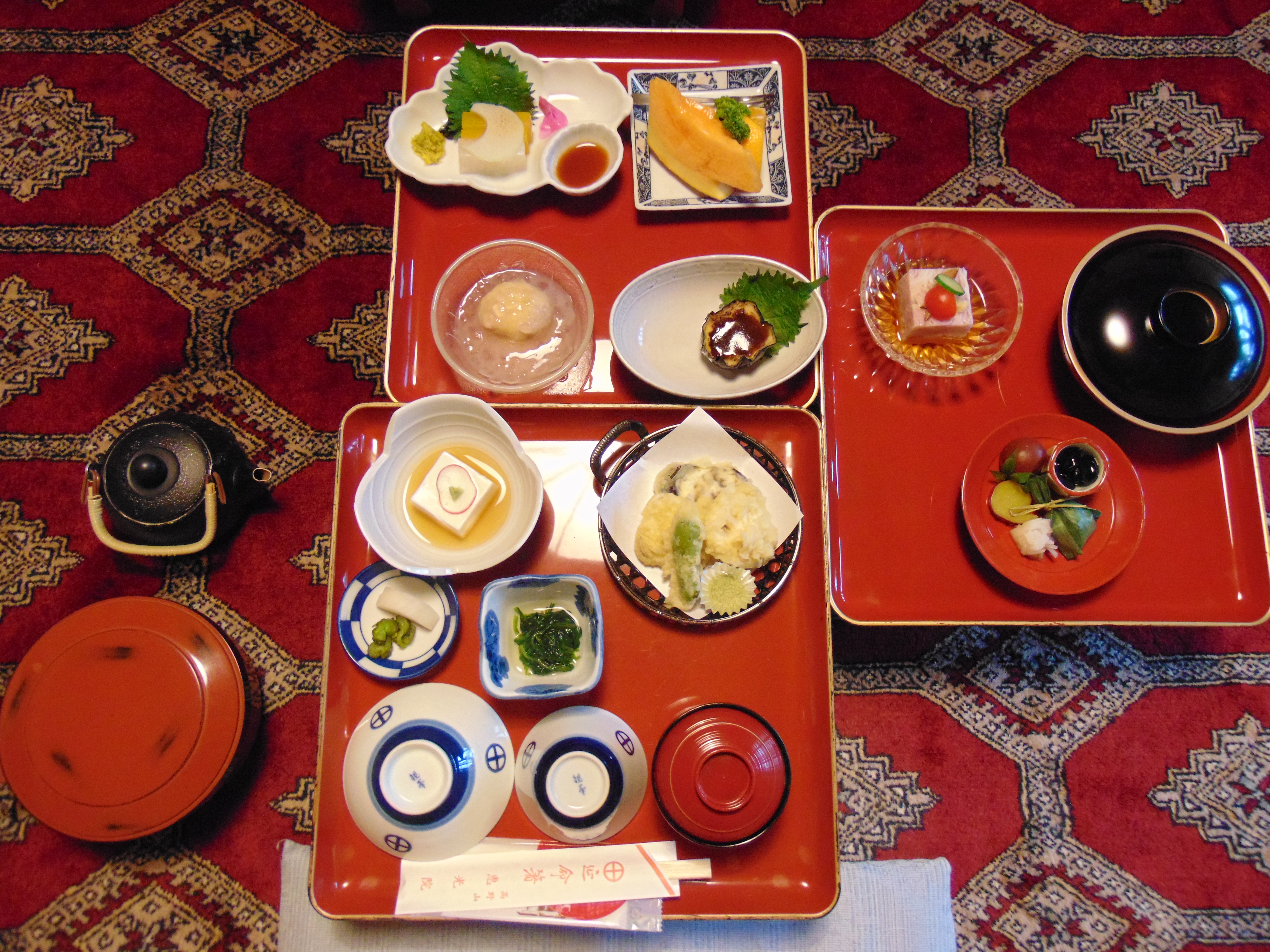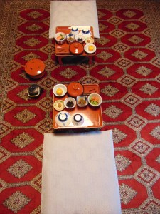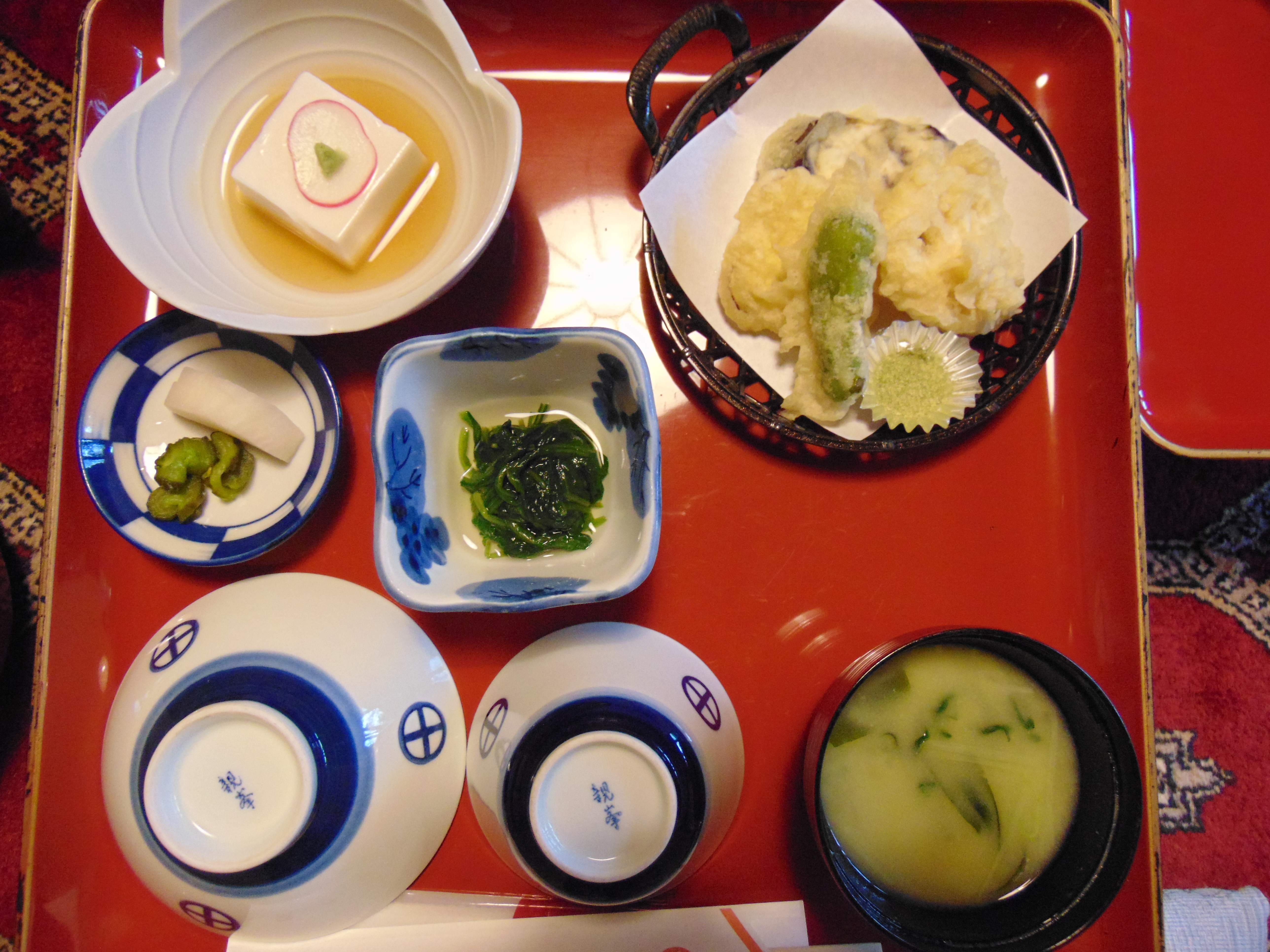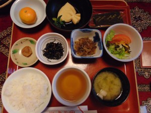 Unlike in Hakone, this time we got all our food served to us at the start so we could sit and eat undisturbed and then just call front desk when we were ready for them to clear it away and make the beds. Perfect! After setting out all our trays, the monk who served us announced, “Let me explain the meal for you. This pot has hot tea. This dish has rice.” And off he went! Those are the two things I’m quite confident I could have worked out for myself! Everything else remained a mystery.