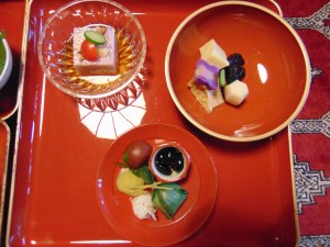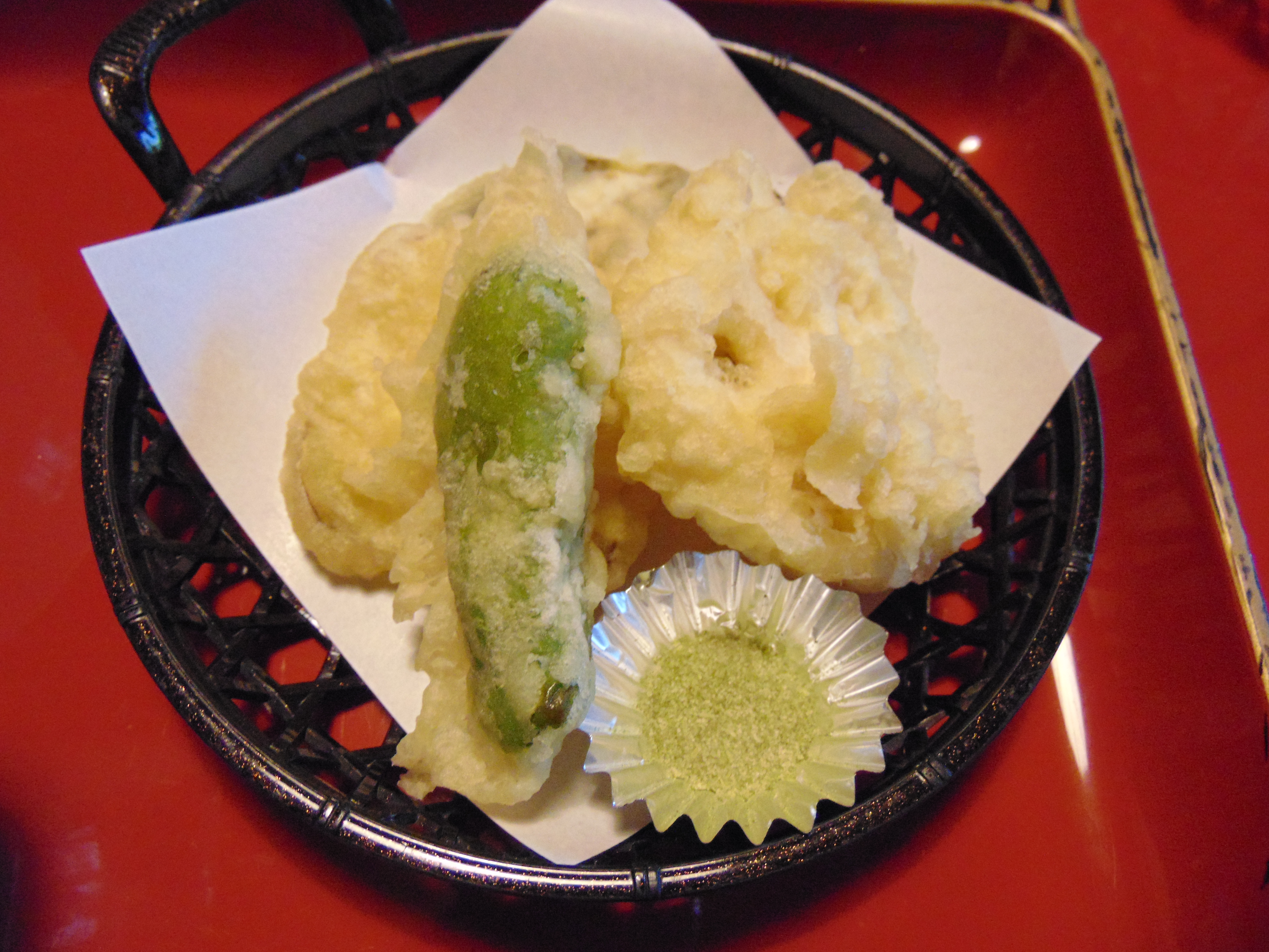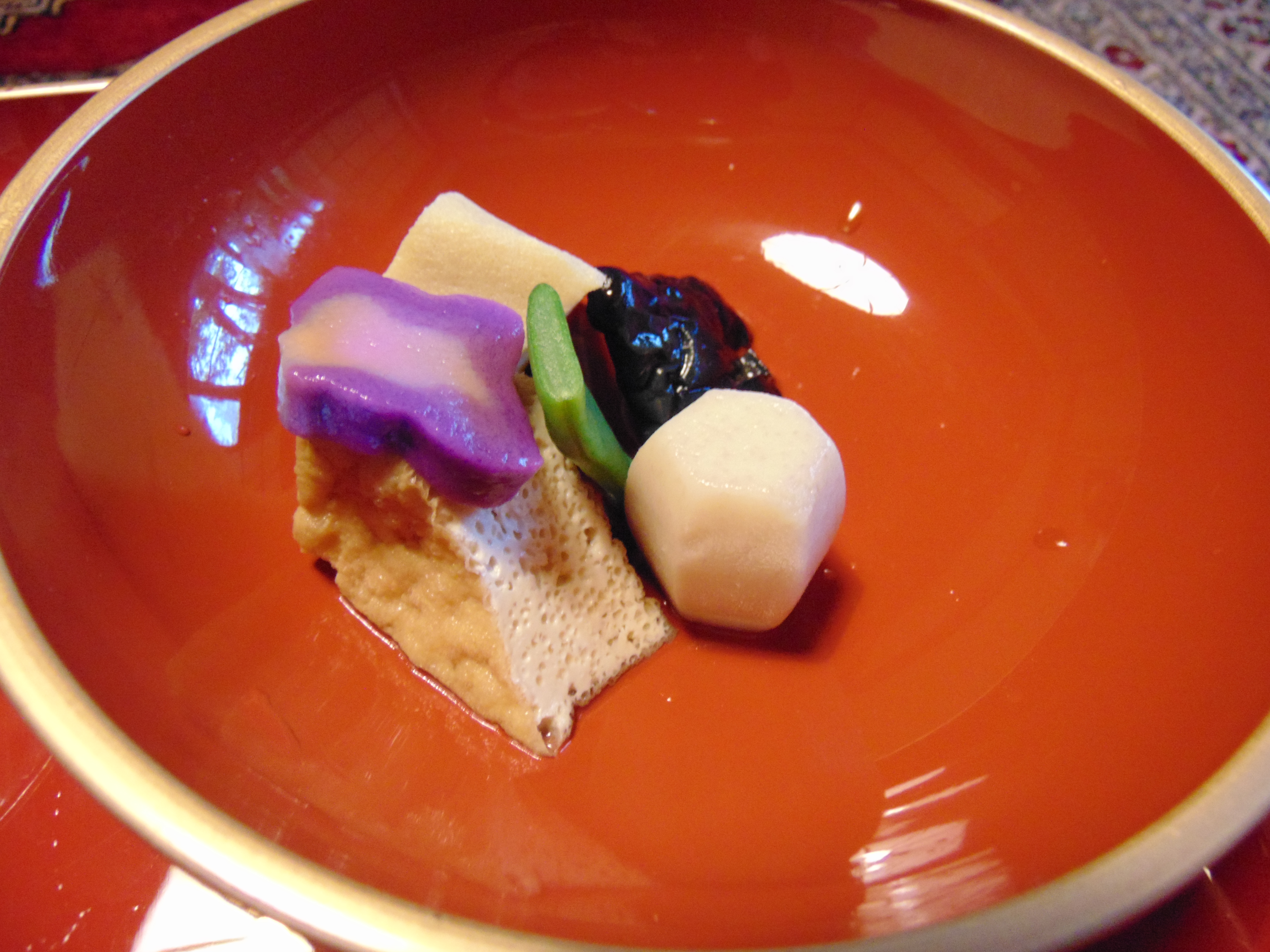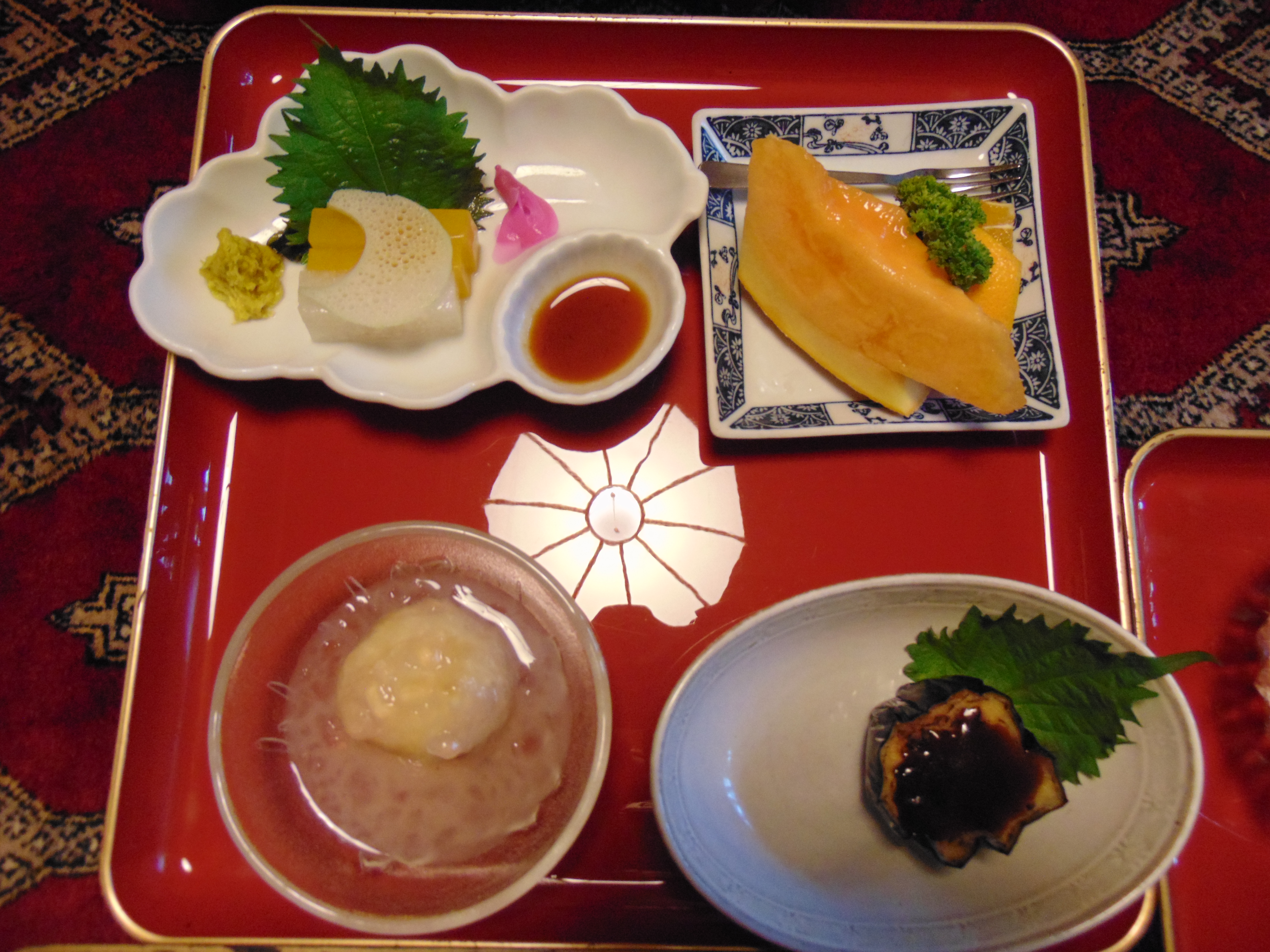 It’s hard to say exactly what each dish was…but at least I recognised this one as tempura! It was really good, and I liked the little cake-case of some kind of green salt. It’s just a shame these were already tepid by the time they were served, but I think this is the problem of serving a multi-course feast to every guest at the same time. Also on this tray we had a really flavoursome soup, some wilted greens, a plate of pickles, and a little block of sesame tofu. This was one of the best things we ate in Japan, it was so creamy it was just like if you’d blitzed together some silken tofu with some tahini. Incredible!