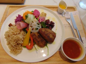 We got two nice but unexciting falafel, some brown rice, two different kinds of hummus, some pumpkin and carrot, plenty of red cabbage, a bit of salad, and a little dish of minestrone soup on the side. It was expensive for what it was, but we didn’t really have an alternative and were happy just to find somewhere. It was colourful and fresh, and it did the job!