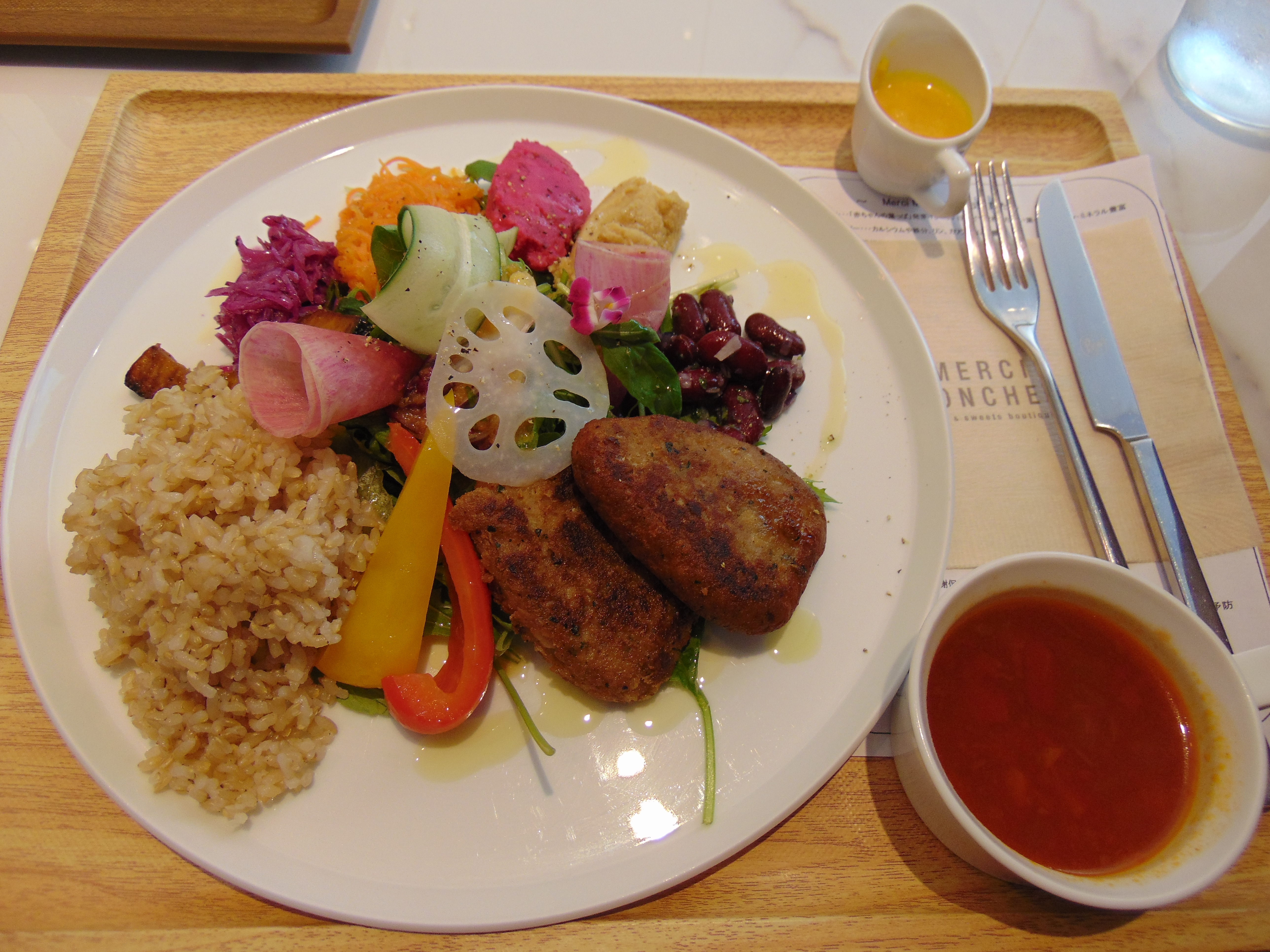 When we arrived we went for a late lunch at Merci Moncher, located in a shopping centre near the station. Nothing was labelled vegan here, but from the list of ingredients and allergens we deduced that the falafel plate should be fine. And “fine” is what it was: not spectacular, no amazing flavours, just a solid plate of food to sustain us for the afternoon.