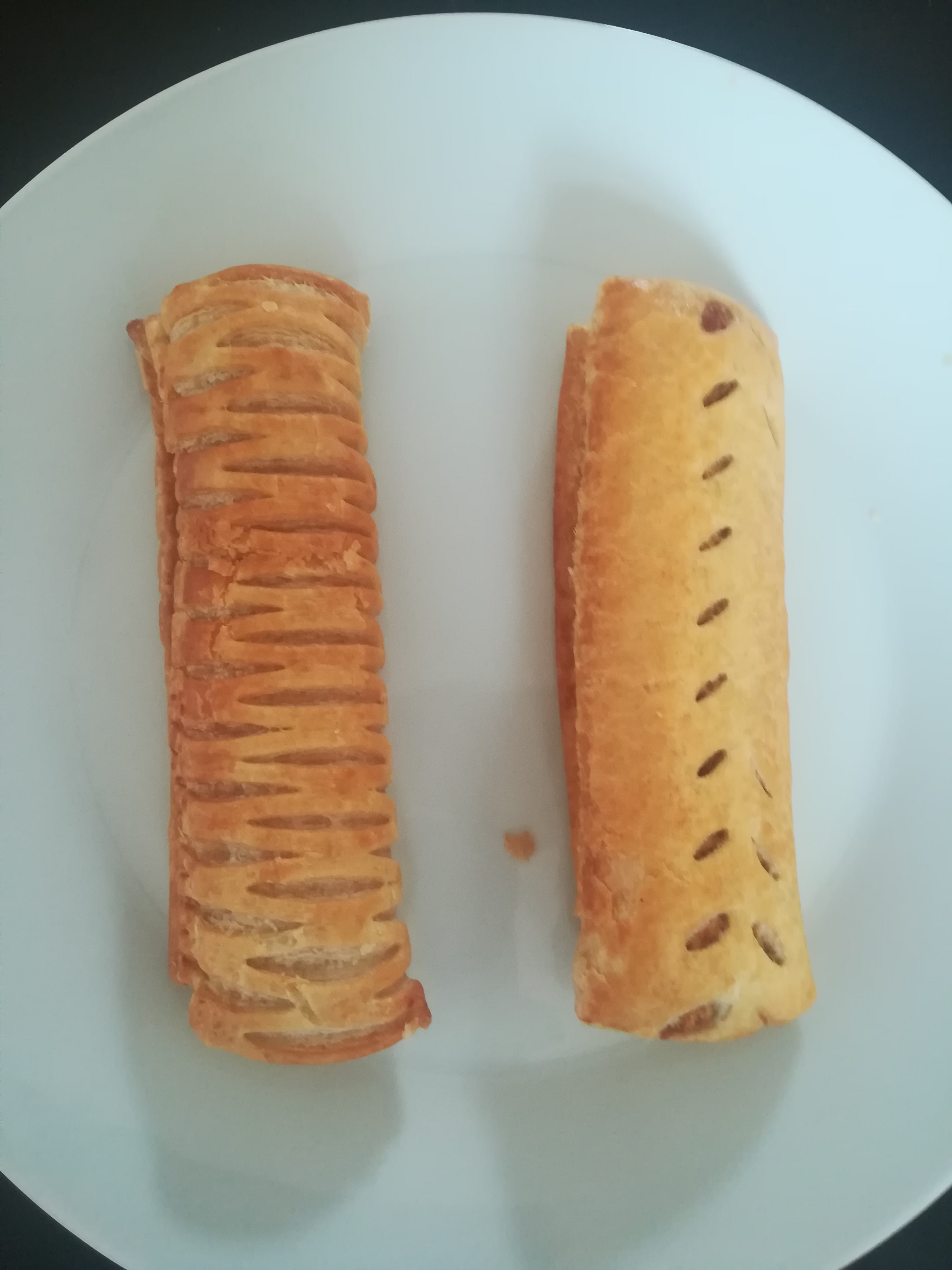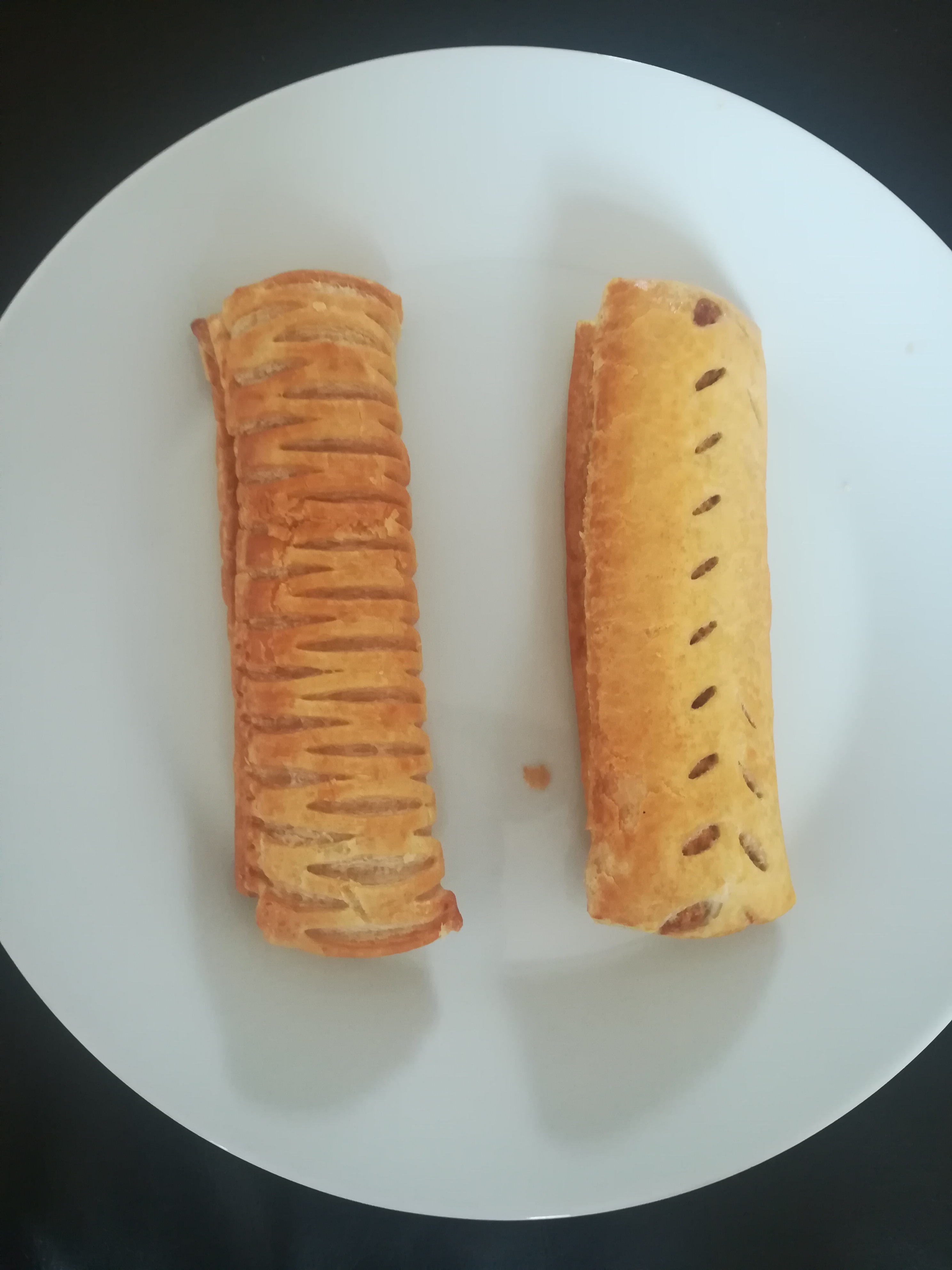 Anyone who is familiar with these two establishments could probably guess which was which, so I probably should have been actually blindfolded for it to be a true test. The Greggs sausage roll, which costs £1 a pop, is the one on the left with the neater pastry styling. The Pound Bakery version, sold at two for £1, is the looser, paler, less ornate roll on the right.
