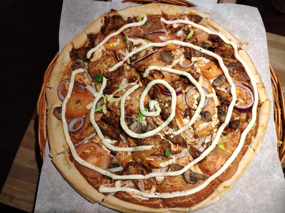 The menu was quite kind to vegans – there was a vegan burger, a vegan dessert, and several vegan pizzas. As well as a vegetable pizza, there were a few with Oumph! chunks on top. It seemed like a decent showing. But alas, all the vegan pizzas replaced cheese with vegan aioli, which is not a fair substitution in my book.