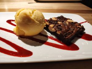 On our final visit we treated ourselves to the vegan dessert as well: a chocolate brownie with mango sorbet and raspberry sauce. I didn’t have much of an appetite for sorbet given the icy surroundings, but it was actually a really good creamy sorbet and not to be sniffed at. The brownie wasn’t a classic bake, and was disappointingly flat, but it was a bit gooey and very chocolatey, so it definitely ticked some of the boxes. I don’t think I’ve ever seen cashews in a brownie before, so that was also something new! All in all, not a mind blowing dessert, but a pretty good one, and I was grateful for the option.