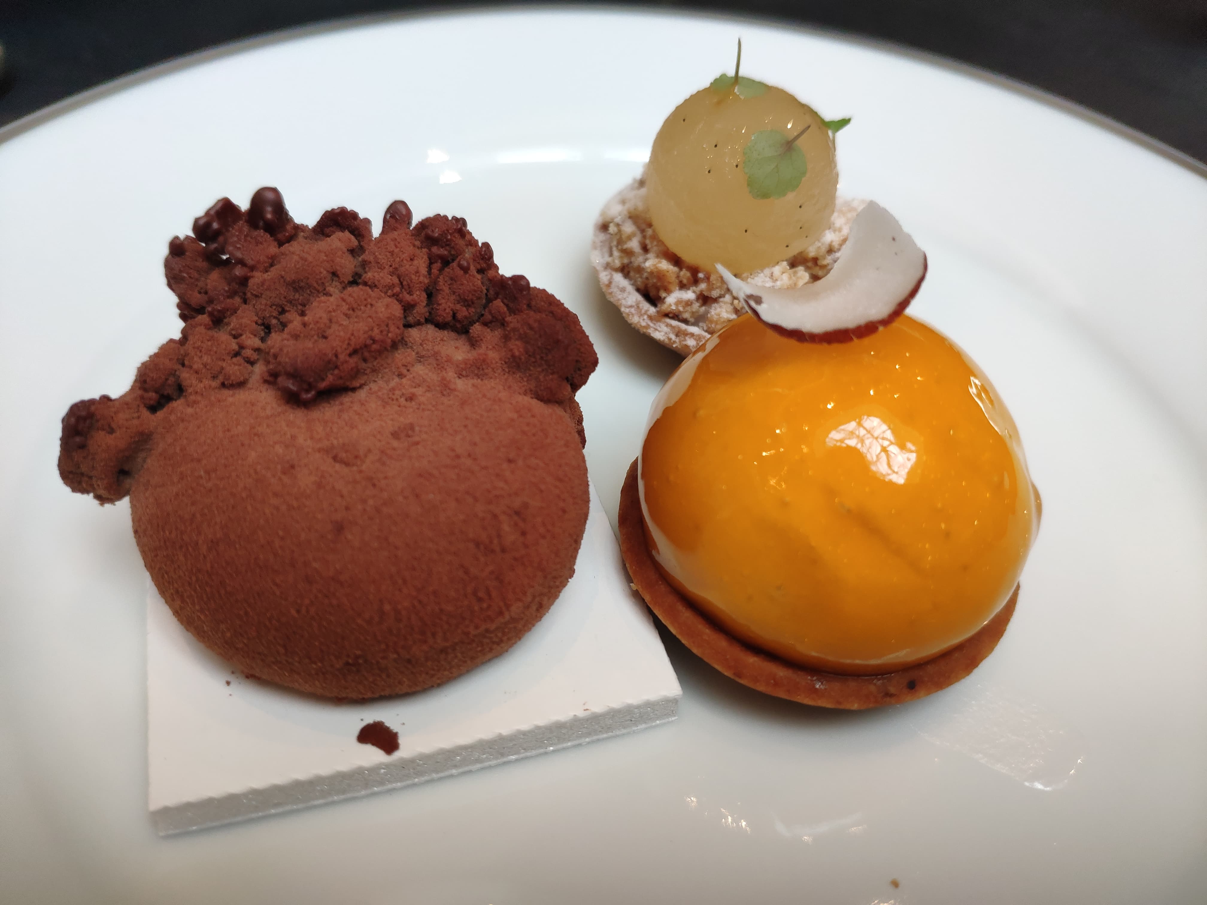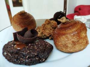 …unlike these ones, which were just a bit too much on top of everything else! The chocolate cookie was, again, really chocolatey, with a nice hit of salted caramel. I loved the texture of the cookie, but Dr HH found it a bit too soft. We were told the pastry was filled with caramel, but Dr HH declared it to be more like some kind of nut butter (I was too full and couldn’t tackle this one) – he also found it breadier than he’d hoped, which was a shame. And in the middle you can just about see a kind of chocolate disc topped with granola – simple, but somehow probably my favourite element of the whole spread!