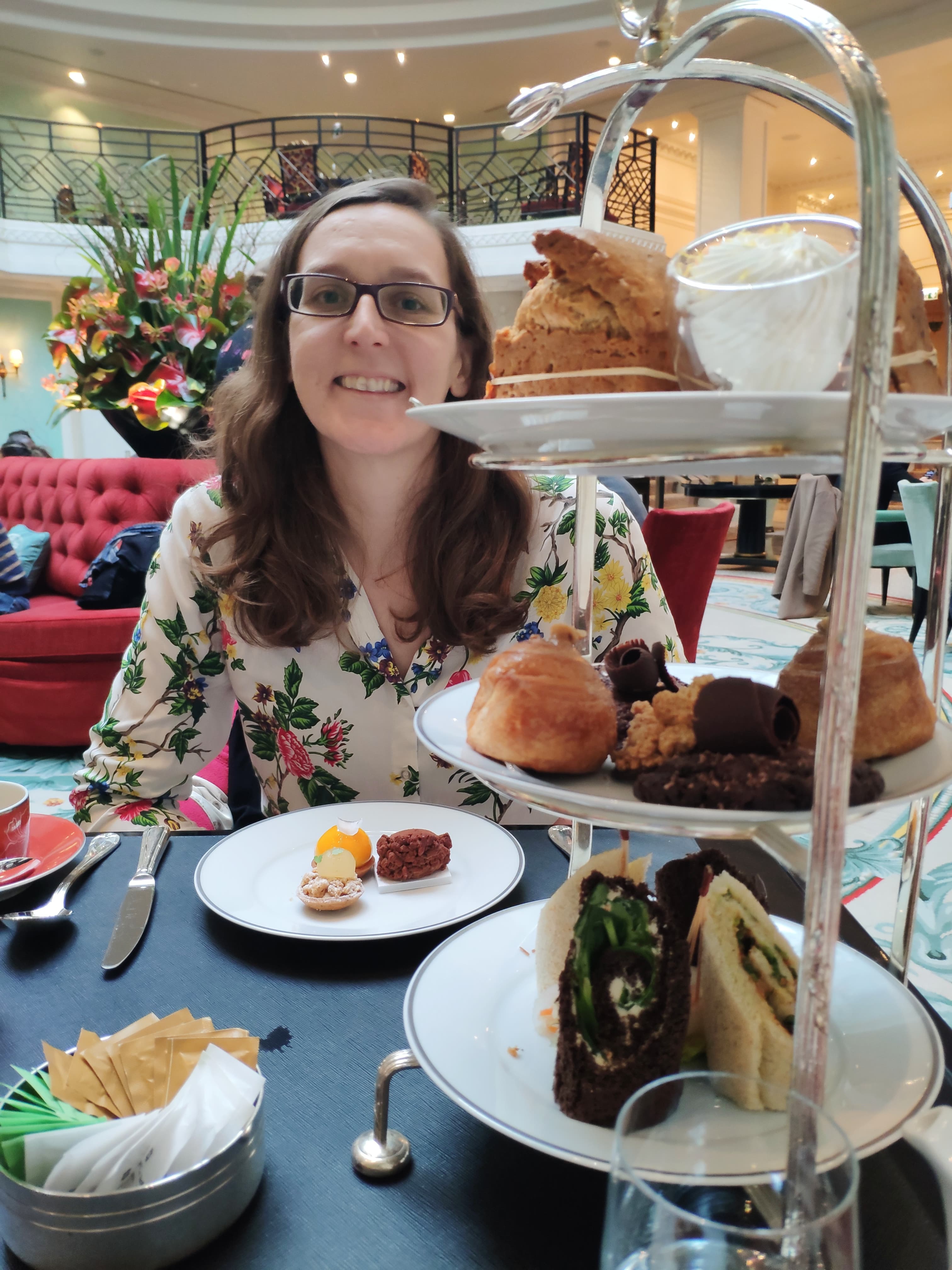 And then we had not one but two sweet plates! This one wasn’t even on the stand, it was served to us separately. You have to love an afternoon tea that can’t be restricted to three tiers. These are the fancy looking desserts of my dreams, and they didn’t disappoint. The chocolate one was sublime, with a very intense chocolatey flavour and a delicious crumb on top which contrasted nicely with the sponge inside. The passion fruit mousse was a welcome refresher after that, sitting on a beautifully crunchy base. And in the background was a small biscuity tart filled with cream and topped with pear (pear again!), which was the perfect combination of textures – and taste, once that cursed pear had been scraped off mine. These morsels were the perfect size for afternoon tea…