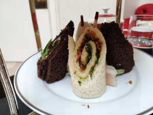 The savoury plate was not particularly ambitious, more’s the pity, but if there has to be one boring plate I’d rather it was the savouries than the sweets. The dark bread was a cream cheese and spinach sandwich, while the white was roasted vegetables. These was also a fresh summer roll with tofu hiding in the middle of the plate. They were all tasty (the cream cheese was especially good), but it would have been nice to see some pastry or something a bit fancier in there.