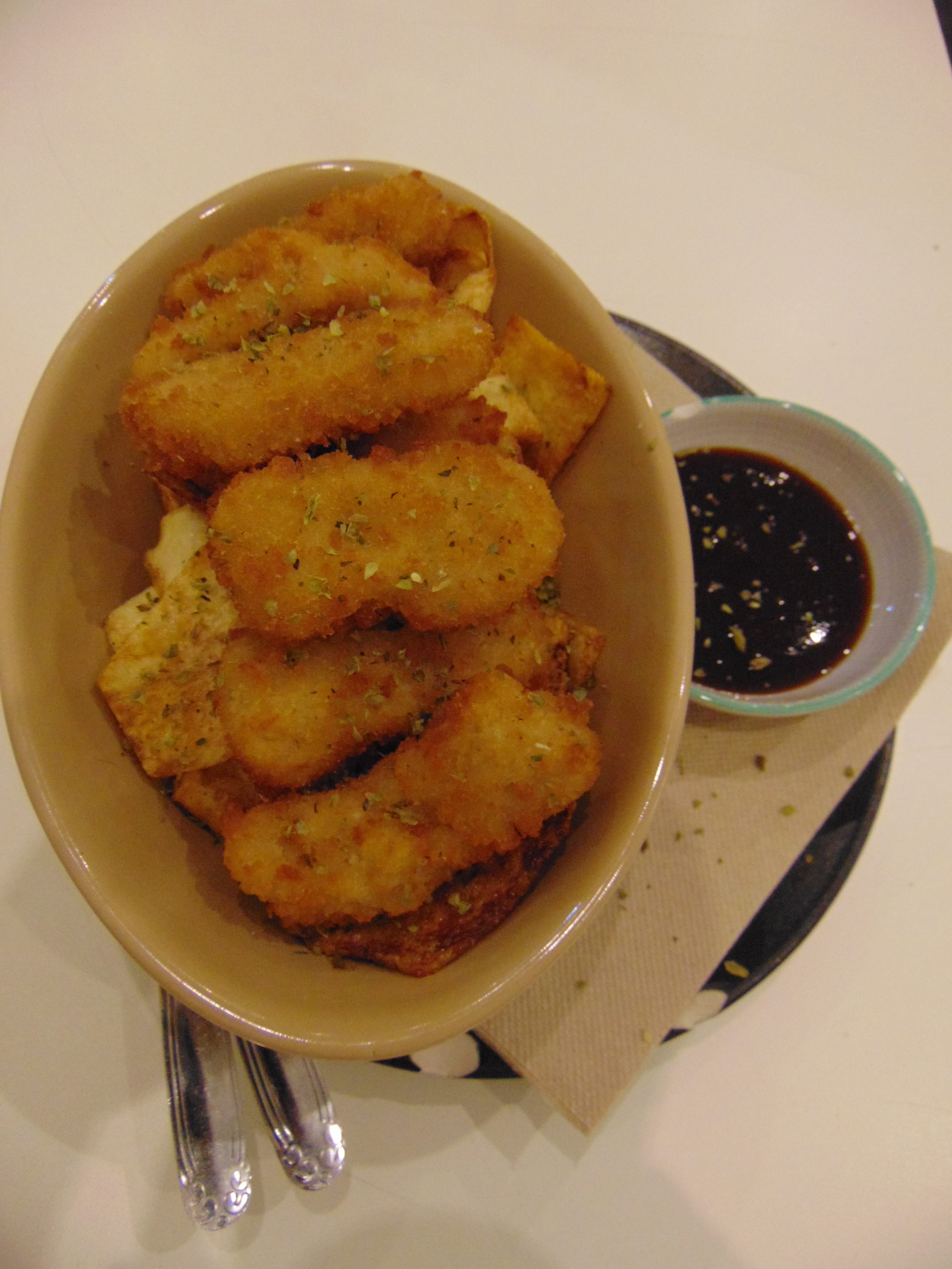 Generosity and maturity, eh? That looks like great food. Do you know what the calamari is made from? Could it be oyster mushrooms or something similar? But I’m with you–I’d probably just want the nuggets and the cheesy potatoes!