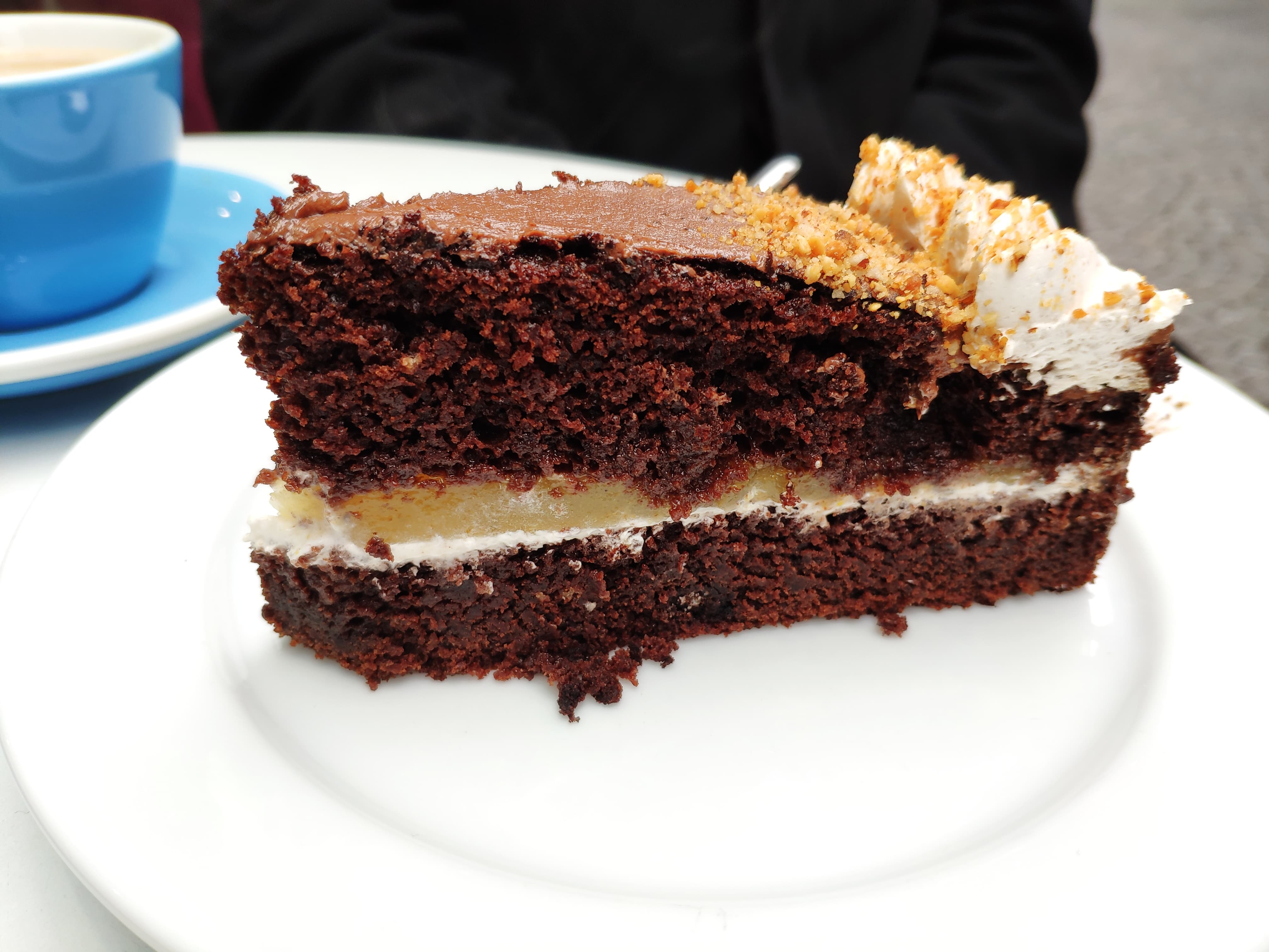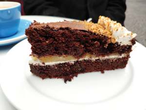 We decided to try to grab an outside table at Cloud Cakes so we could at least see what all the fuss was about. We ordered a slice of chocolate fudge cake to share, and I suppose I was expecting more, based on the crowds. It was a good cake, but not the best I’d ever had – and I was displeased to find a layer of fruit in the middle. That is not what I expect from a chocolate fudge cake!