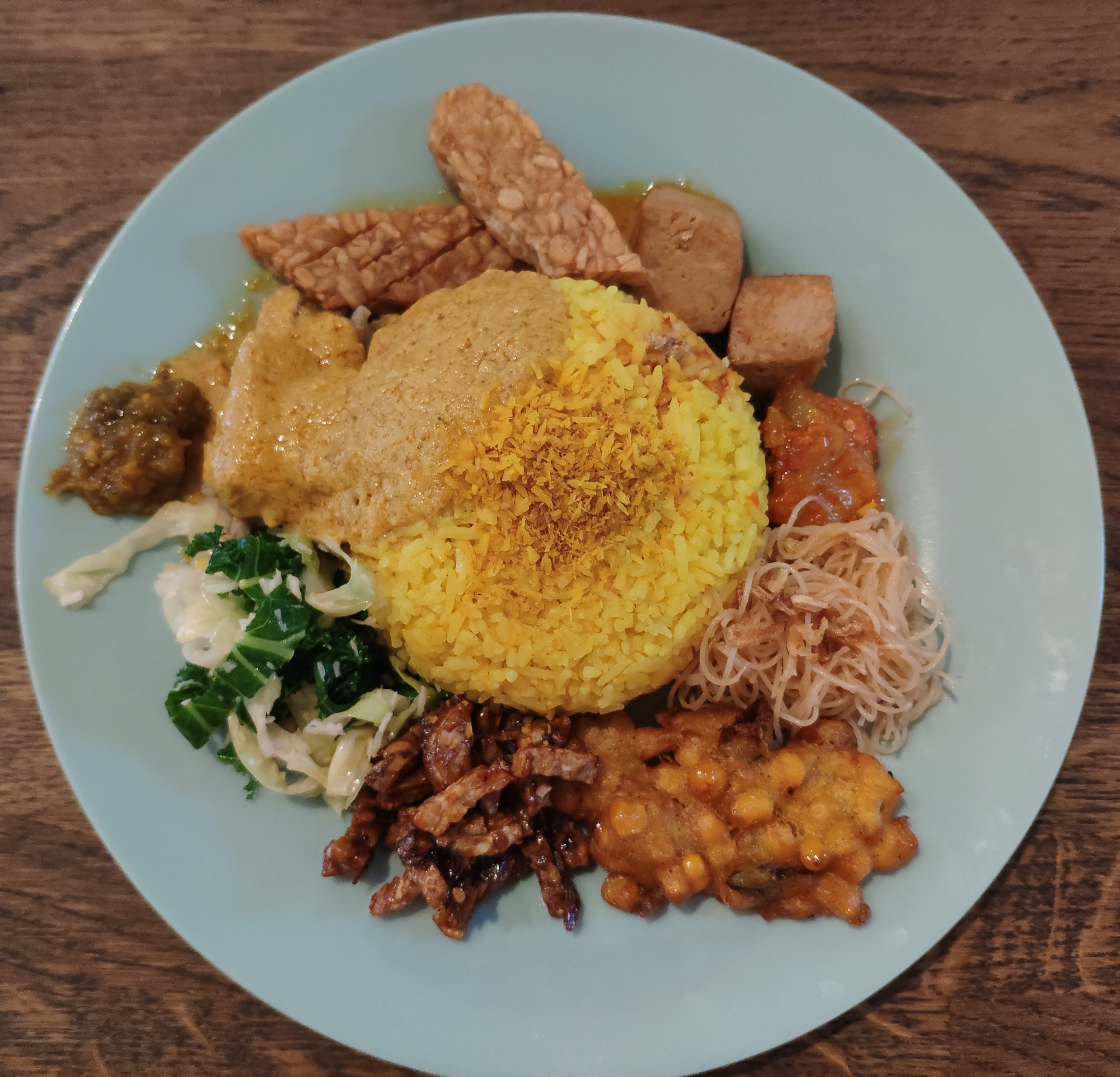 On the plate I had a corn fritter, noodles, a bit of aubergine in a tomato sauce, some nicely cooked tofu, fried tempeh, jackfruit in a peanut sauce (think gado-gado salad), a blob of chilli sauce, salad, tempeh brittle, and a big pile of nicely seasoned rice with more peanut sauce in the middle. Everything tasted great. There was a really good variety in the plate which led to a new and exciting mouthful each time. The tempeh brittle was sticky, sweet, and salty, and was like nothing I have ever had before. I really enjoyed the peanut sauce, it was sweet and well spiced. Previous versions I’ve had in gado-gado salads have just been very sweet.