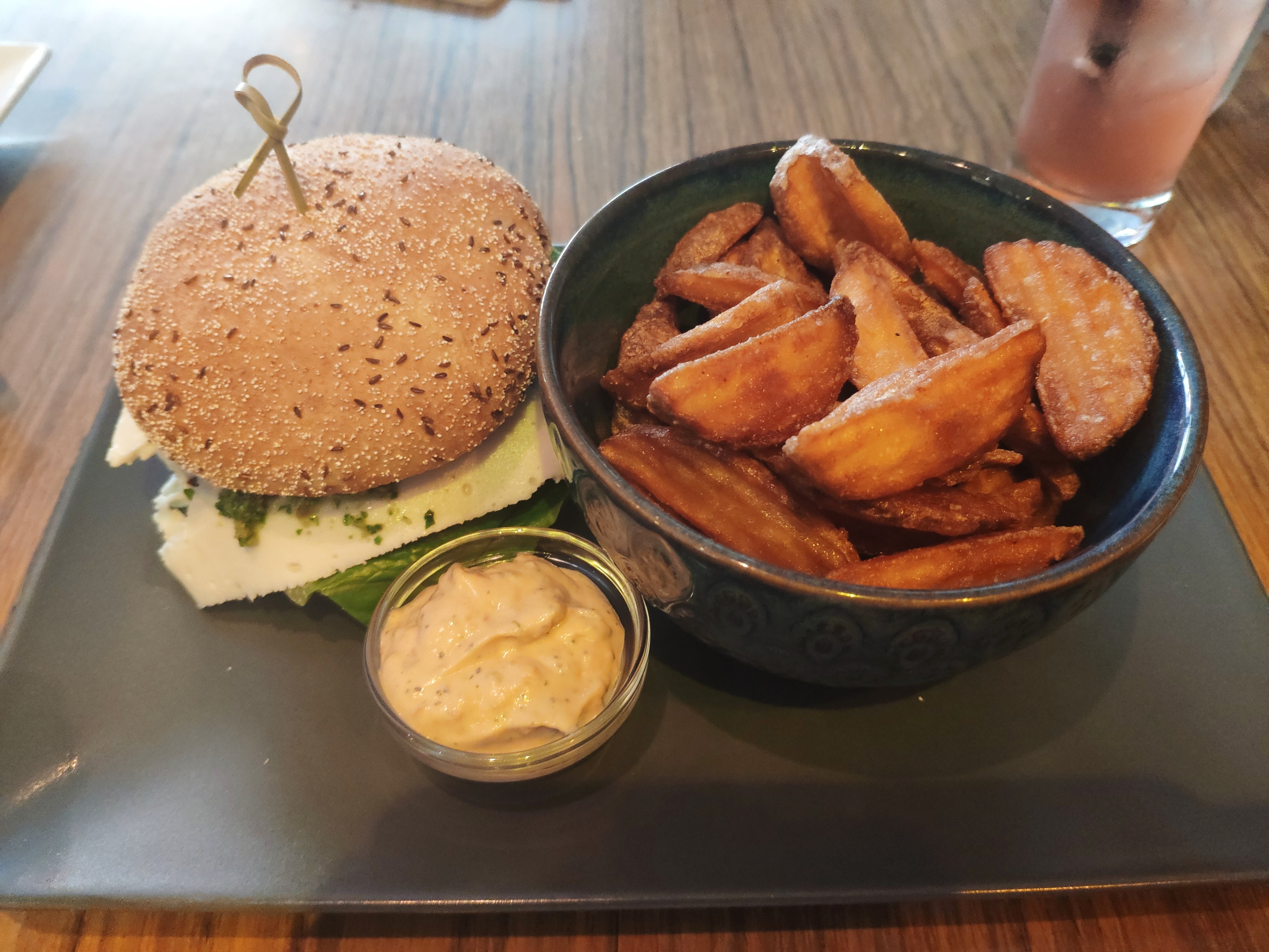 For mains, the menu didn’t excite me too much. There were a couple of quite salady looking options on the menu, so I shunned them and went for the summer burger: a seitan burger in sourdough bread with mayo, lettuce, rocket pesto, and homemade mozzarella. Of course, I paid extra to get the fries too. The patty was fine, nice and crispy on the outside, with a good savoury taste. The mozzarella was very enjoyable with a good texture and taste. It was a tasty burger overall and I preferred it to the one from the night before. The chips were the real star of the show, they were round crinkle cuts that were folded into a V shape. They were incredibly crispy and perfectly seasoned, I could have eaten them all night long. I was a bit too full for dessert and again nothing really jumped out at me as a must try. I enjoyed the meal and would definitely go back on another visit if the menu looked a bit more enticing to me.