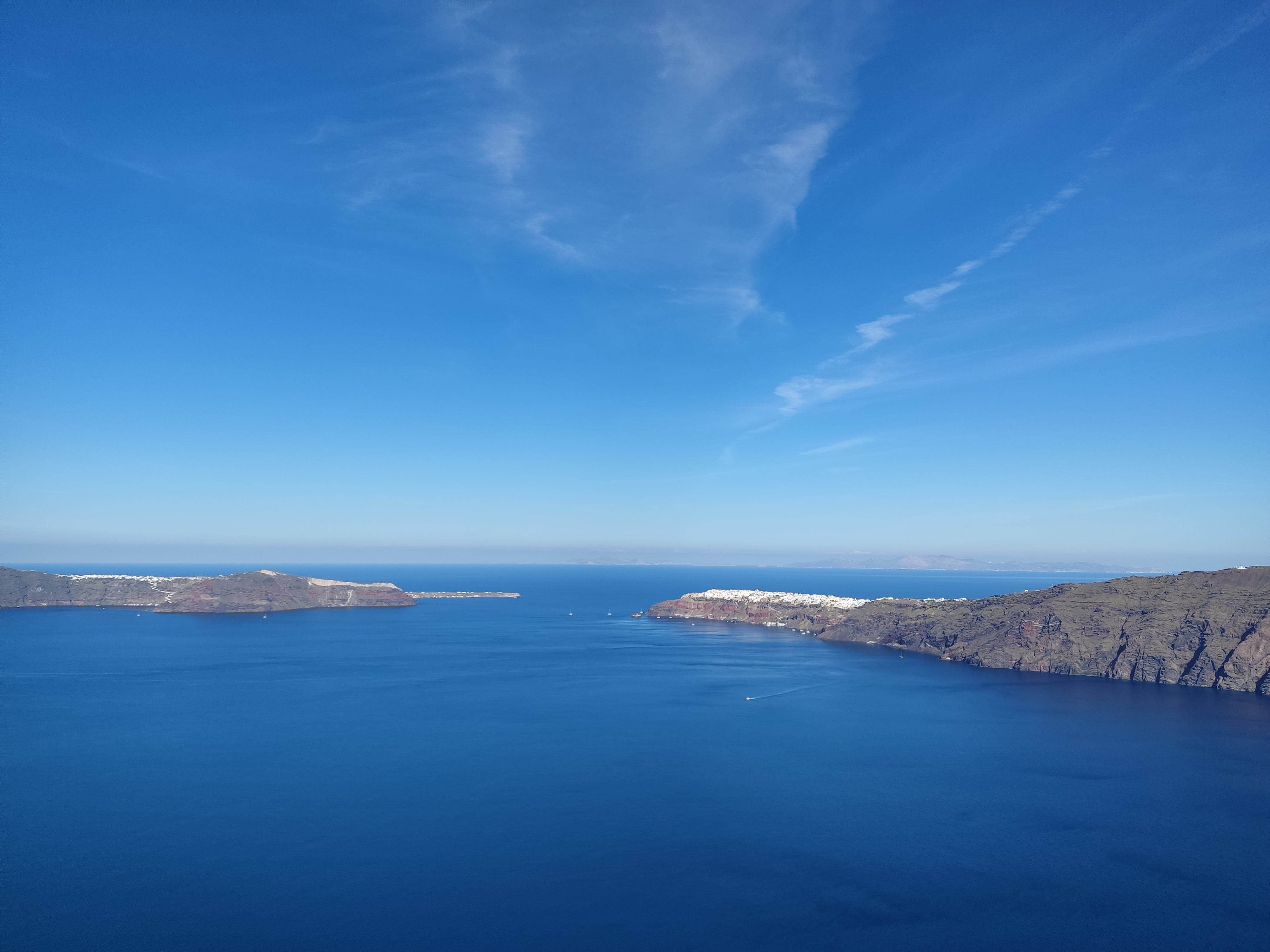 Oia is, along with Fira, one of the main towns on Santorini, and you can see it far away in the right of the photo above – it’s famous for its white buildings with blue domes. Bus routes connect the two towns, but we wanted to walk there. It’s about a 10km walk and it covers a variety of terrain – sometimes you’re on paved paths, sometimes on tracks, and there was one point when it felt like we were walking on shale. It’s a bit hilly, and it’s all exposed to the elements, but it’s not a difficult walk – just a bit of a long one.