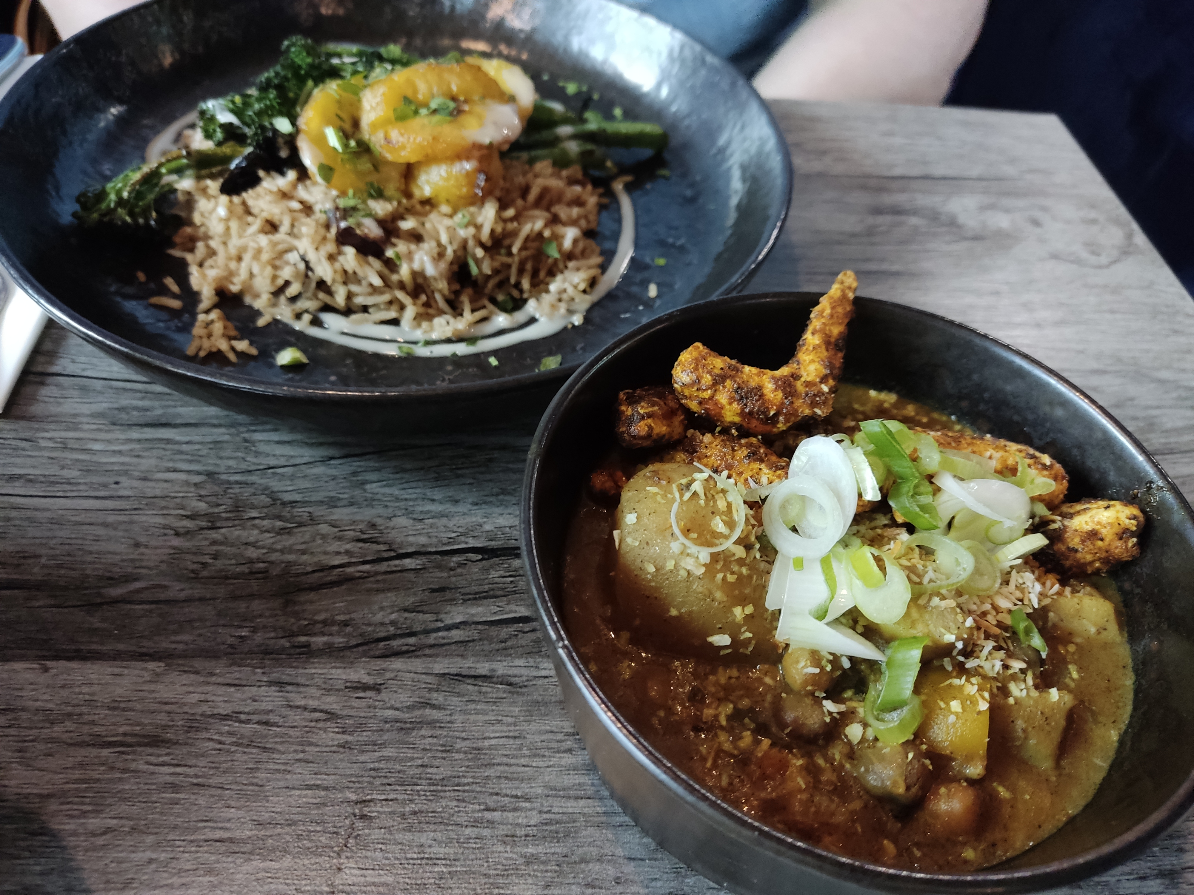 Mother HH ordered the curry prawns, as she’s had some good experiences with vegan prawns. She was a fan! There was a lot of warmth in the curry, but it was not too fiery and there was a bit of sweetness from coconut. She was impressed with the texture of the prawns as well, though the flavour was not really there, perhaps overpowered by the curry. She also loved the cooking of the rice and peas, and enjoyed the plantain (which she’d never had before) and tender stem broccoli, which kept a bit of bite. She declared it a flavoursome and enjoyable dish!