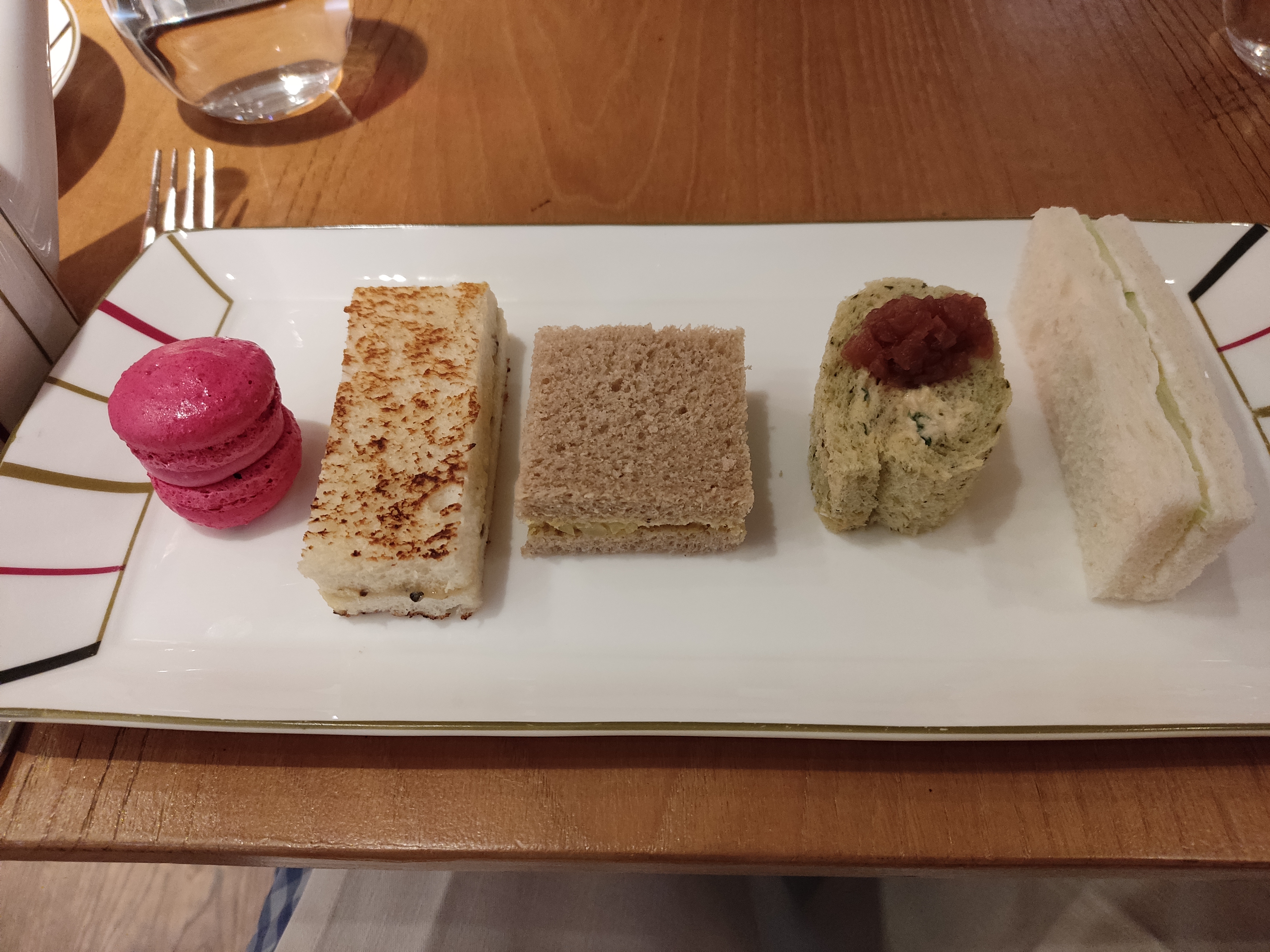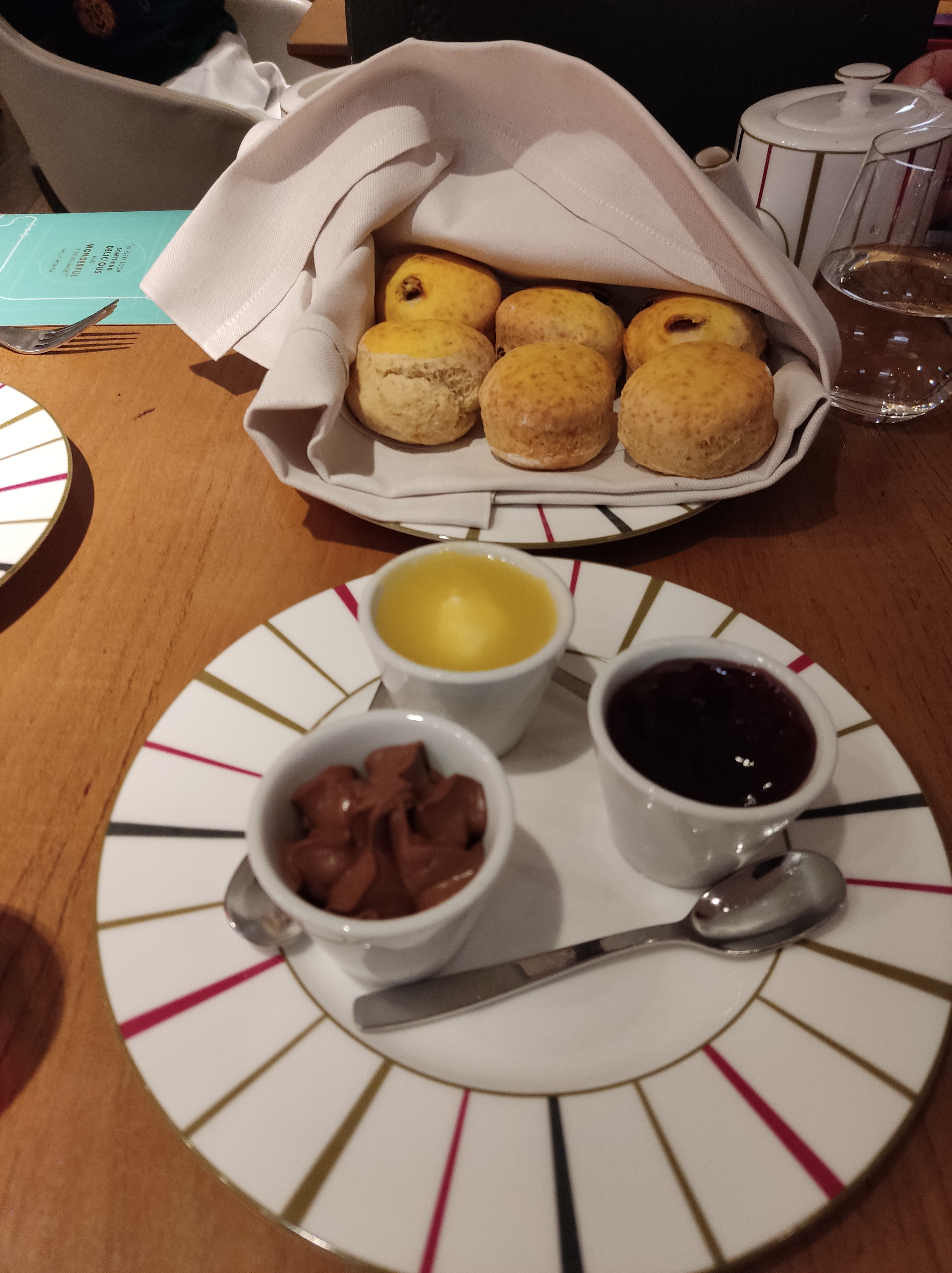 There was a bit more of a twist when we were served the scones. The scones themselves were pretty standard, one plain and one raisin each. They were quite small, which was perfect for a big meal, and nicely baked. We got a pot of chocolate ganache, which was too decadent for my companions, but I enjoyed it in moderation – you definitely didn’t need to ladle it on. Then there was a pineapple cream, which looked a bit split and unappetising in the pot but was actually really good. It was quite mildly flavoured and went nicely with the “snozberry” jam. While this sounded exciting, it was just strawberry. Still, there was a bit of a twist on the classic scone course, so we were on board.