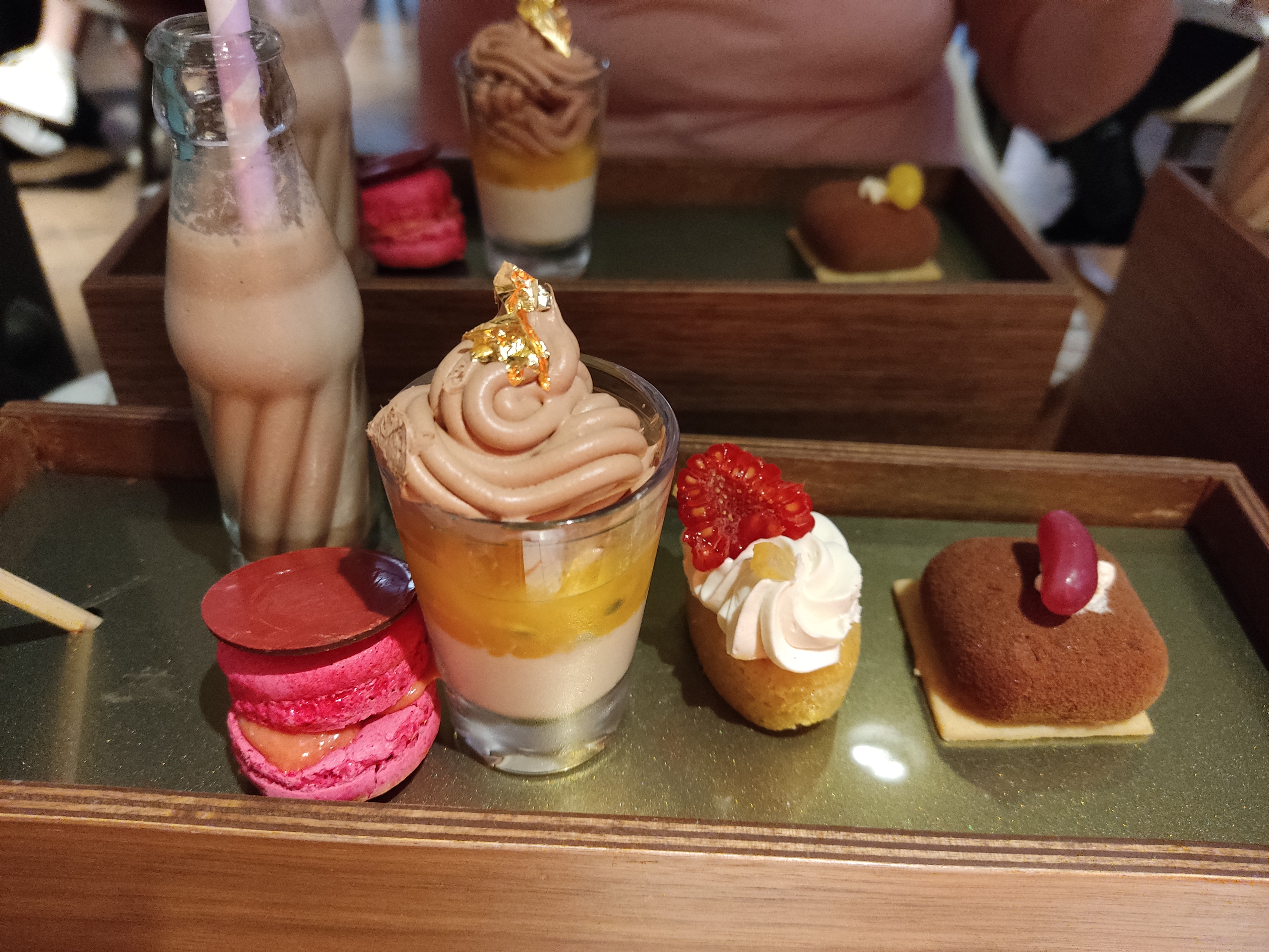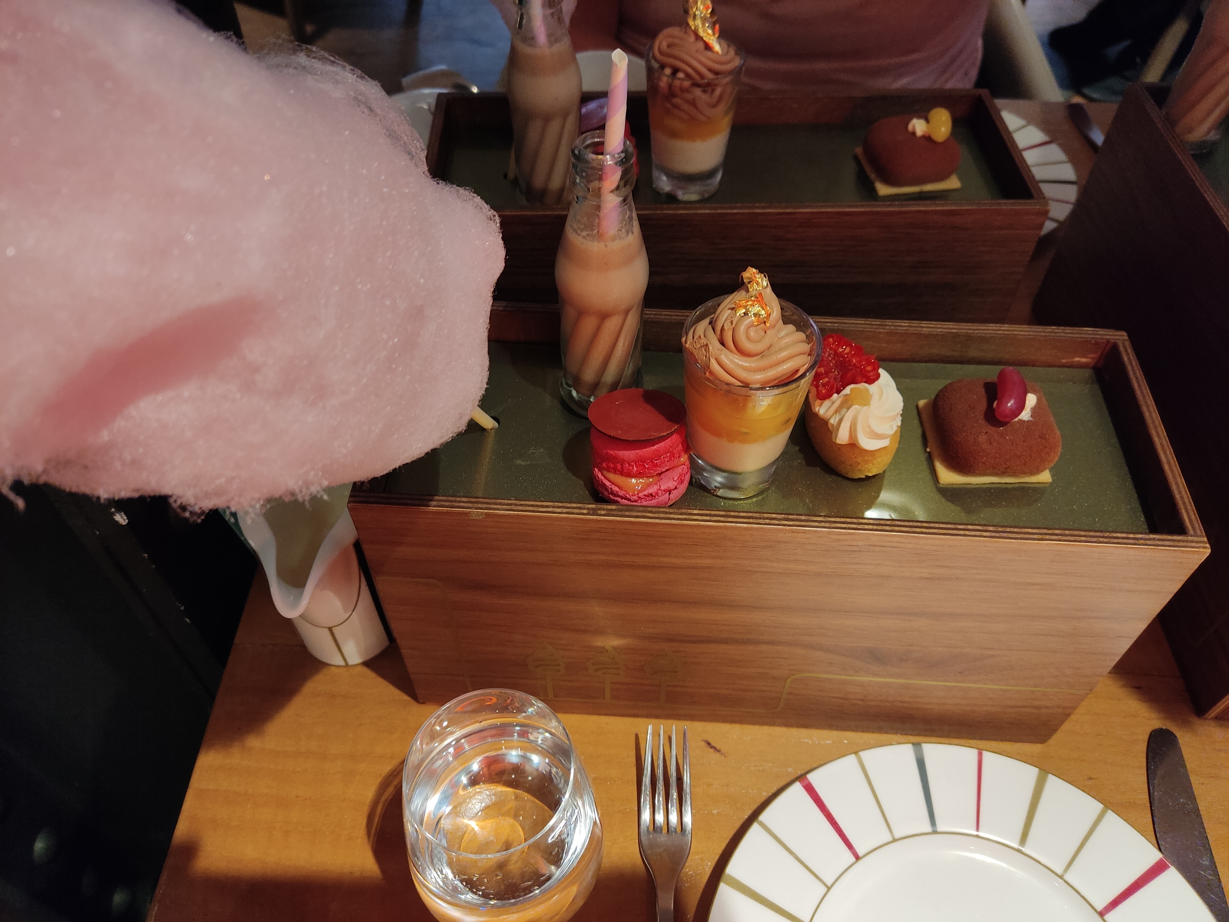 Then came the desserts, the real showcase of the meal! I’ll go through them from left to right again. It seemed like the bubblegum candy floss was popular with the younger diners in the room, but quite unnecessary for us – we just tried a bit and moved on to the good stuff. There was a little chocolate milkshake, which had the texture of chocolate milk rather than a shake. That wasn’t really a problem considering the size of the meal, but still, it’s nice to get accurate terminology. And then there was another macaron, this time strawberry flavoured with a chocolate disc on top. This was my favourite of the sweets, though Mother HH and Dr HH preferred the savoury macaron. The chocolate on top was really fun though, it elevated the texture.