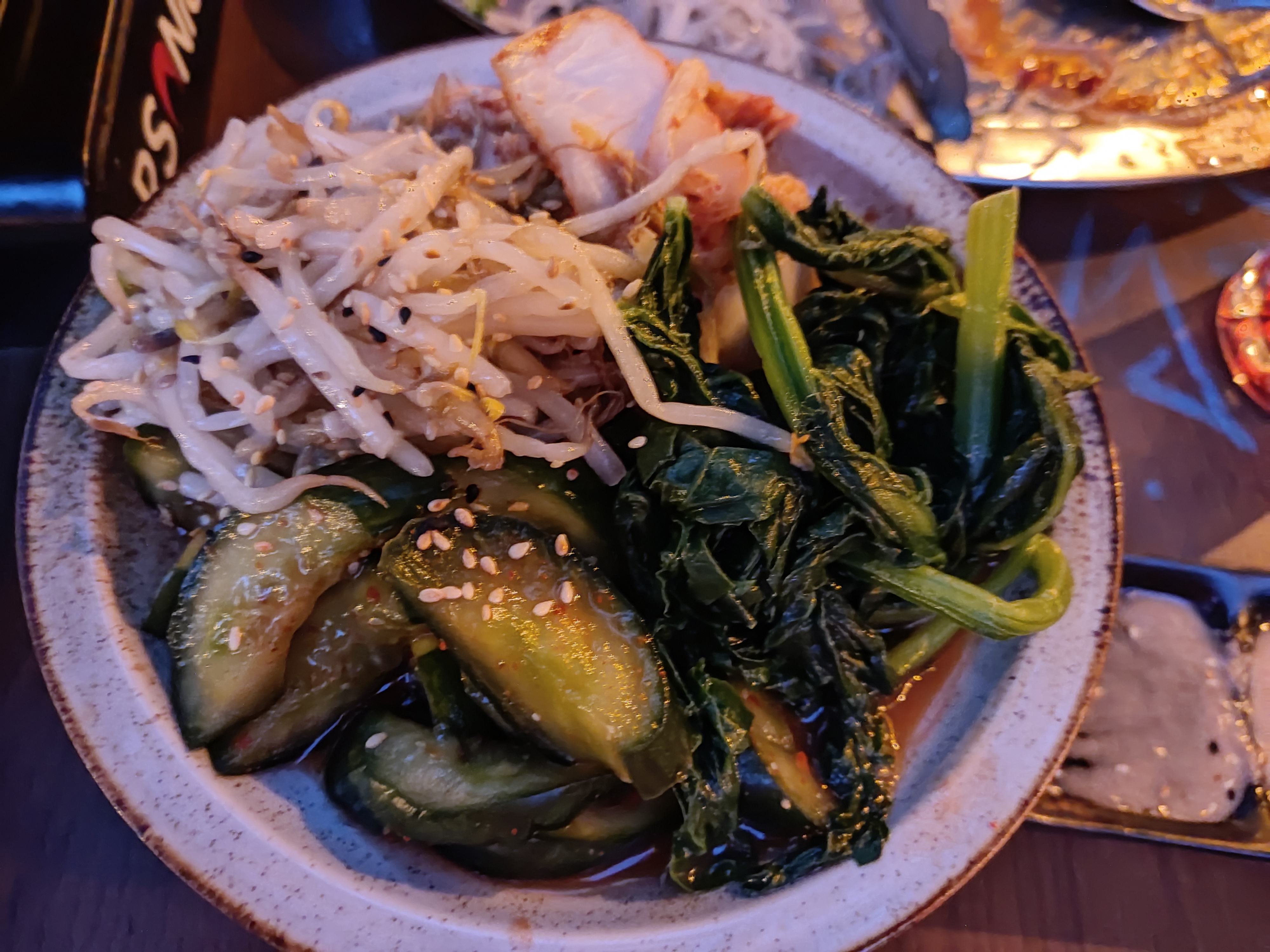 On our last visit, we ordered the BBQ menu for two, and it was quite the experience! Neither of us had ever had a dish like this before, so we were a bit worried about our ability to cook our own meal at the table – fortunately, the instructions from the waiter were perfect and he came back to check we’d switched everything off properly at the end. We got a plate of noodles, saucy soy meat, and raw veg, and cooked it up at our table.