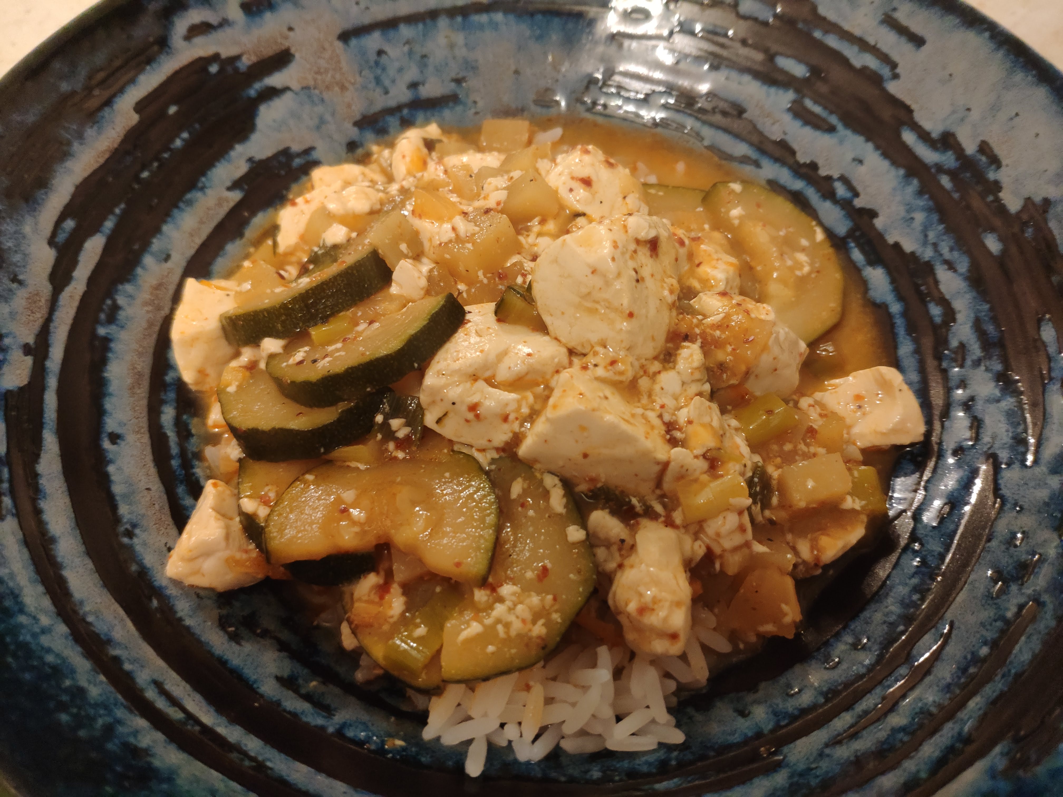 This one was spicy! It was also easy to make. I used regular courgette rather than the recommended hobak, and a stock cube rather than homemade vegetable broth. The only real seasoning is the gochugaru, which brings a lot of heat. I loved the silken tofu, and the other vegetables were tasty, plus it was very easy to just chuck it all together. I have toned down the spiciness on subsequent occasions, but Dr HH loved this first iteration!