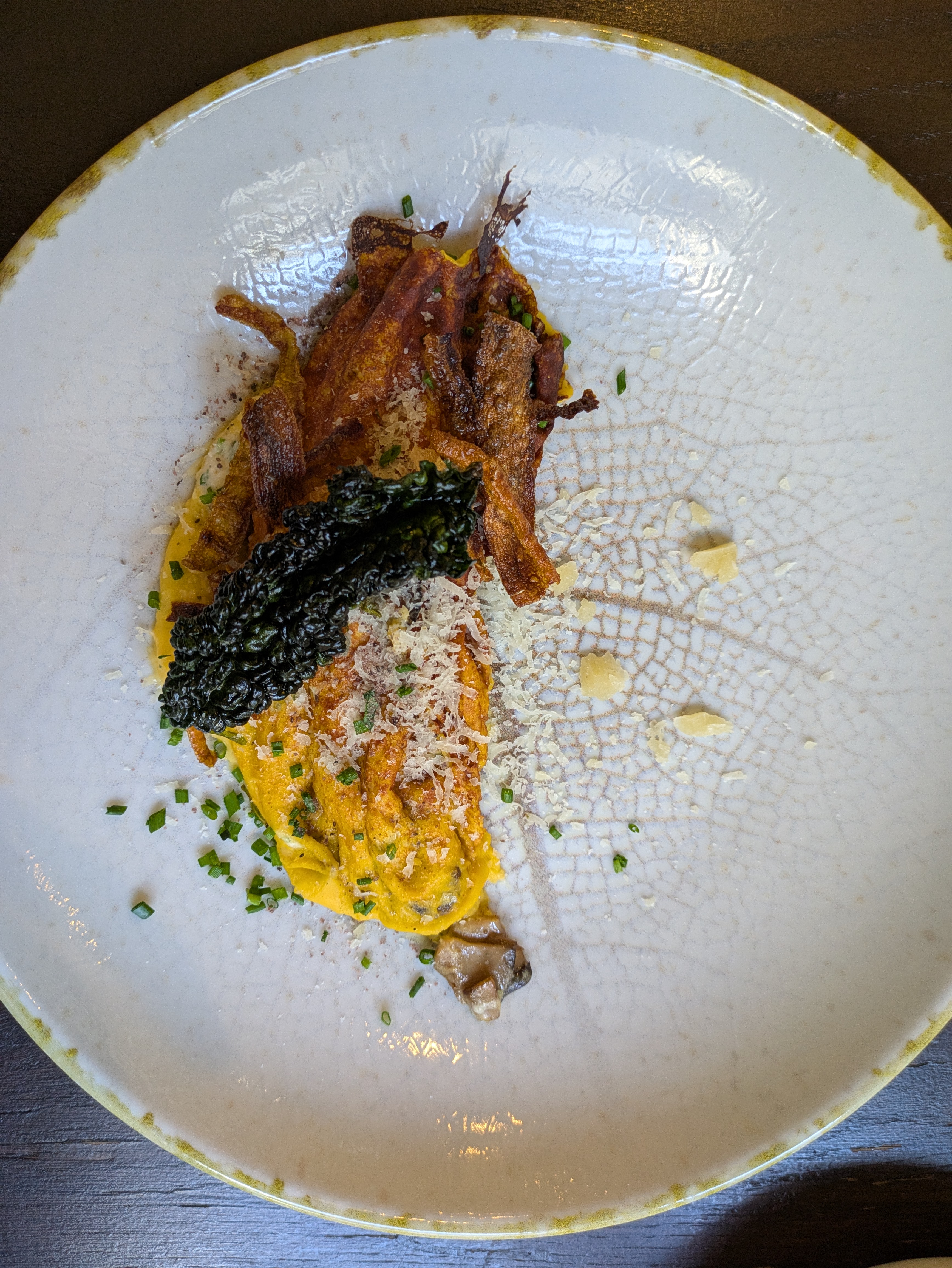 There were lots of exciting savoury dishes. The standout was a pumpkin lasagna (pictured above alongside a polenta cutlet), which fortunately was not one of those terrible ones that replaces the pasta with a vegetable: it had pasta, along with a pumpkin layer which added a nice bit of bite. There was also some mince and a cheesy top. We both loved it.